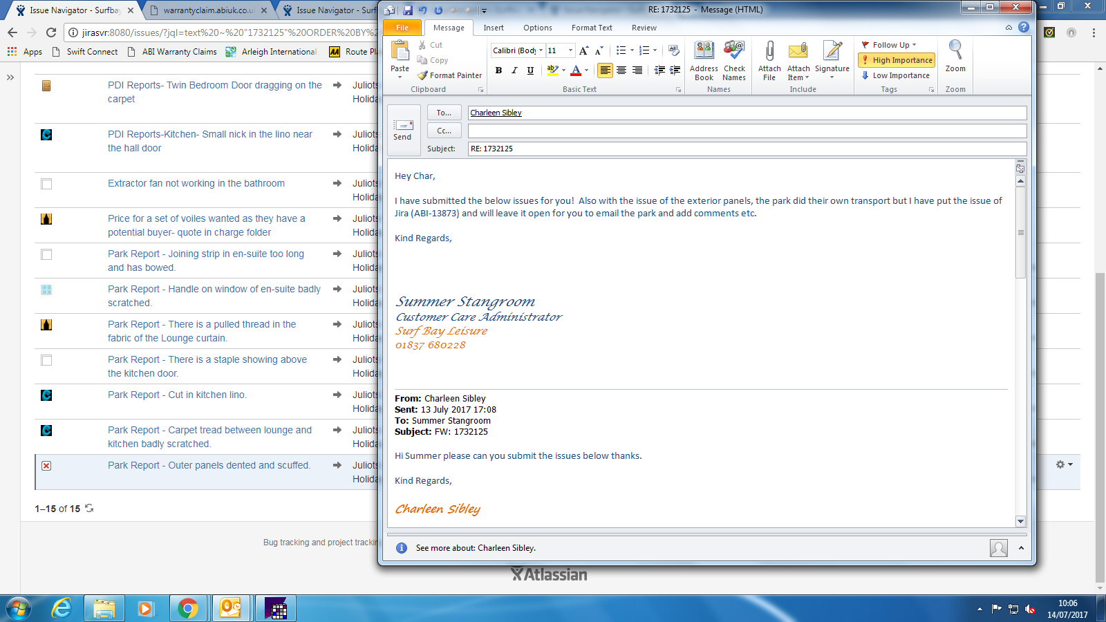 | Summary | Park Report - Handle on window of en-suite badly scratched.COMPLETED | Park Report - Handle on window of en-suite badly scratched.COMPLETED - THIS CANNOT BE CLOSED OFF PROBLEM ON JIRA |