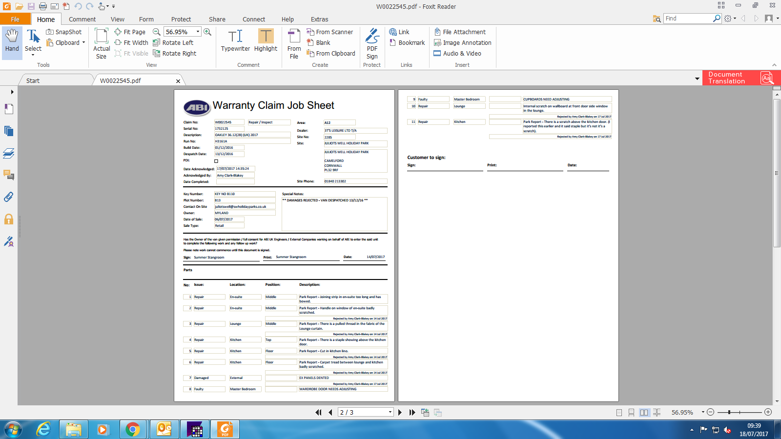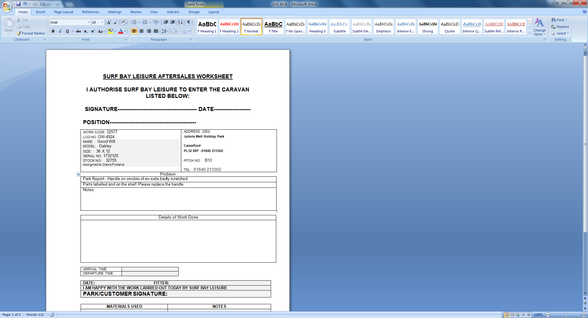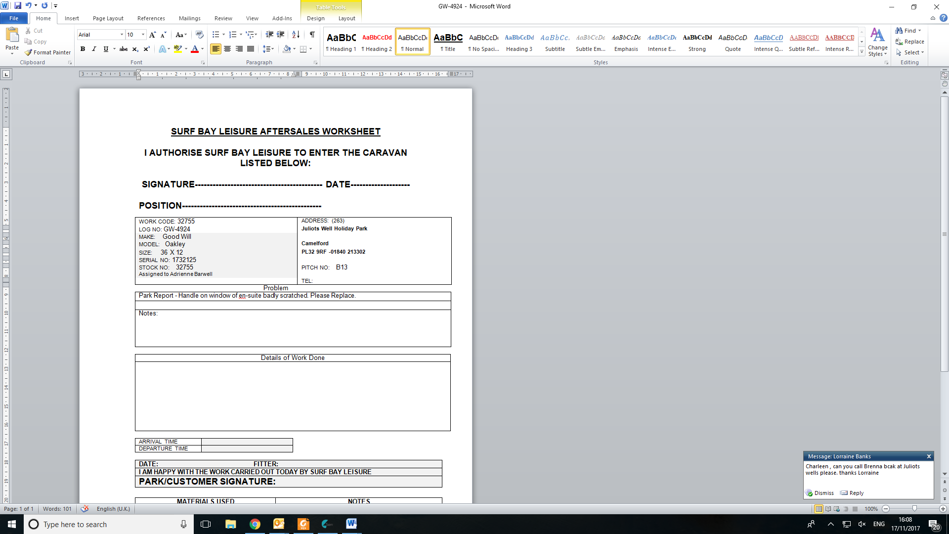 | Summary | Park Report - Handle on window of en-suite badly scratched. | Park Report - Handle on window of en-suite badly scratched.COMPLETED |