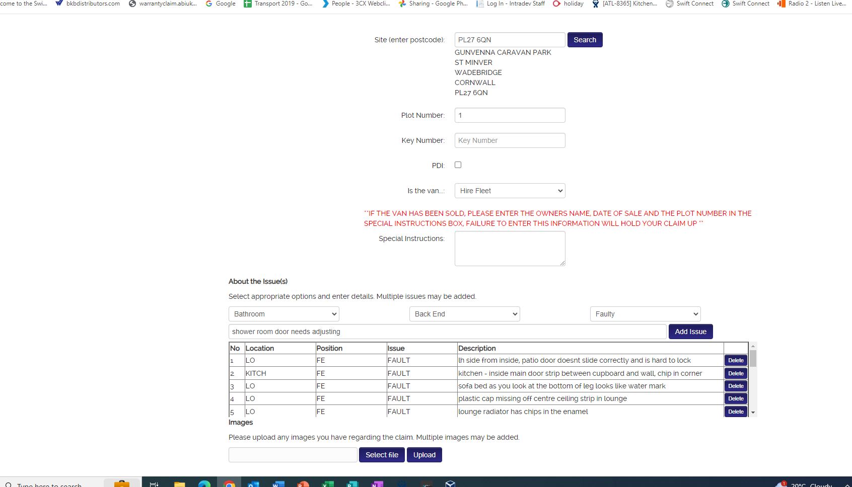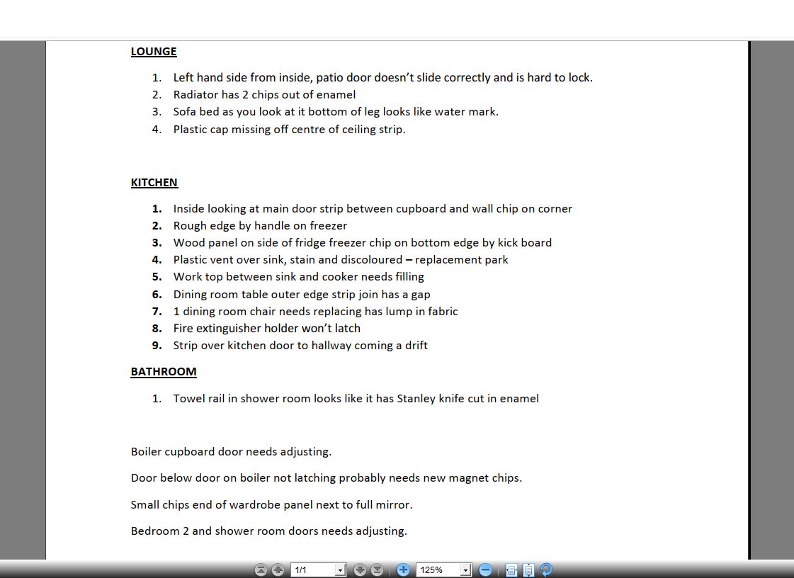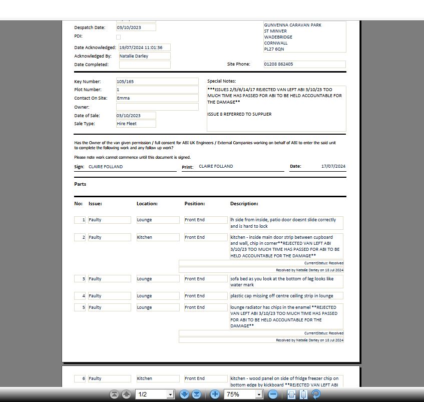 Claire Folland added a comment - GUNVENNA CARAVAN PARK ST MINVER WADEBRIDGE CORNWALL PL27 6QN Model: HAMILTON 36.12 (2B) 2024 Serial Number: 2230084   You have logged the following issues:   1. STATUS: New lh side from inside, patio door doesnt slide correctly and is hard to lock 2. STATUS: Resolved kitchen - inside main door strip between cupboard and wall, chip in corner**REJECTED VAN LEFT ABI 3/10/23 TOO MUCH TIME HAS PASSED FOR ABI TO BE HELD ACCOUNTABLE FOR THE DAMAGE** 3. STATUS: New sofa bed as you look at the bottom of leg looks like water mark 4. STATUS: New plastic cap missing off centre ceiling strip in lounge 5. STATUS: Resolved lounge radiator has chips in the enamel **REJECTED VAN LEFT ABI 3/10/23 TOO MUCH TIME HAS PASSED FOR ABI TO BE HELD ACCOUNTABLE FOR THE DAMAGE** 6. STATUS: Resolved kitchen - wood panel on side of fridge freezer chip on bottom edge by kickboard **REJECTED VAN LEFT ABI 3/10/23 TOO MUCH TIME HAS PASSED FOR ABI TO BE HELD ACCOUNTABLE FOR THE DAMAGE** 7. STATUS: New kitchen - plastic vent over sink stained and discoloured, replacement required 8. STATUS: Referred to Supplier kitchen - 1 dining room chair needs replacing, has lump in fabric 9. STATUS: New kitchen - dining room table outer edge strip has a gap 10. STATUS: New kitchen - worktop between sink and cooker needs filling 11. STATUS: New kitchen - fire extinguisher holder wont latch 12. STATUS: New kitchen - rough edge by handle on freezer 13. STATUS: New kitchen - strip over kitchen door to hallway coming a drift 14. STATUS: Resolved bathroom - towel rail in shower looks like a stanley knife has cut the enamel **REJECTED VAN LEFT ABI 3/10/23 TOO MUCH TIME HAS PASSED FOR ABI TO BE HELD ACCOUNTABLE FOR THE DAMAGE** 15. STATUS: New boiler cupboard door needs adjusting 16. STATUS: New door below door on boiler not latching, probably needs a new magnetic catch 17. STATUS: Resolved small chips end of wardrobe panel next to full mirror **REJECTED VAN LEFT ABI 3/10/23 TOO MUCH TIME HAS PASSED FOR ABI TO BE HELD ACCOUNTABLE FOR THE DAMAGE** 18. STATUS: New bedroom 2 door needs adjusting 19. STATUS: New shower room door needs adjusting   The current contact details we have for you are: