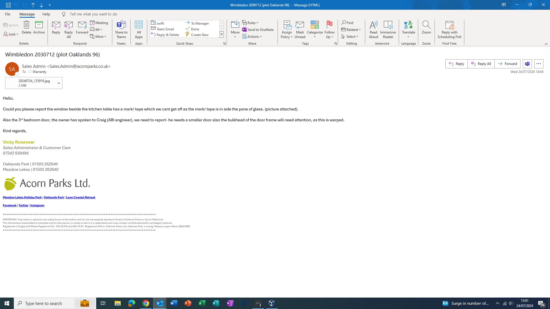 Claire Folland added a comment - received email from park, waiting for customer name and date of sale
