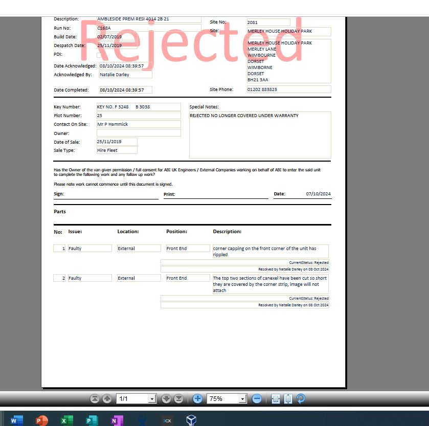 Claire Folland added a comment - ABI have rejected claim, no longer under warranty, emailed Matt