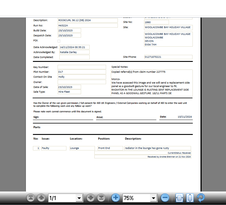 Claire Folland added a comment - Hi,   You have recently submitted a warranty claim under the above serial number for the below issue,   • radiator near main entrance rusty.   Please see below comments from our supplier,   After assessing this image it does look like to radiator has been knocked causing the chip, however as this is just the side panel we will send a replacement side panel only as a goodwill gesture to our local engineer to fit.