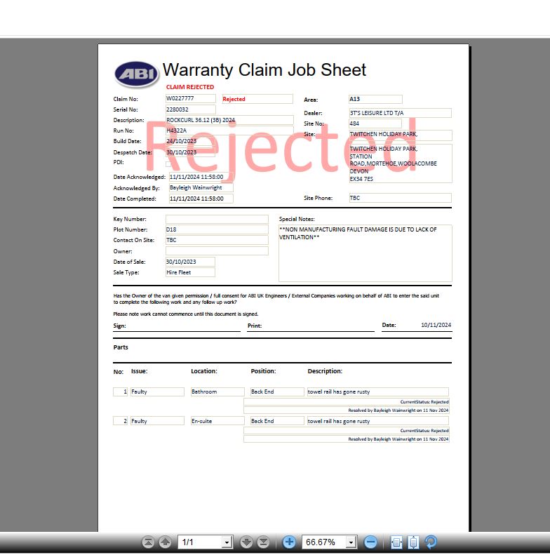 Claire Folland added a comment - ABI have rejected claim, not a manufacturing issue, damaged caused to lack of ventilation