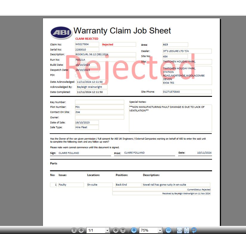 Claire Folland added a comment - ABI have rejected claim, non-manufacturing issue, damage has been caused by lack of ventilation