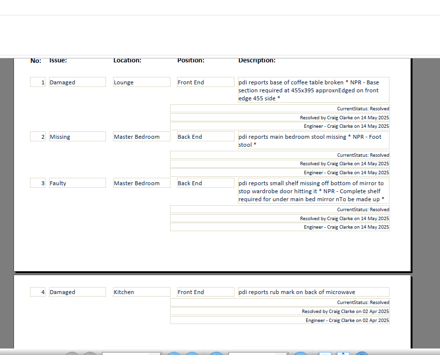 | Summary | CLONE - pdi reports main bedroom stool missing | pdi reports small shelf missing off mirror to stop wardrobe door hitting it |