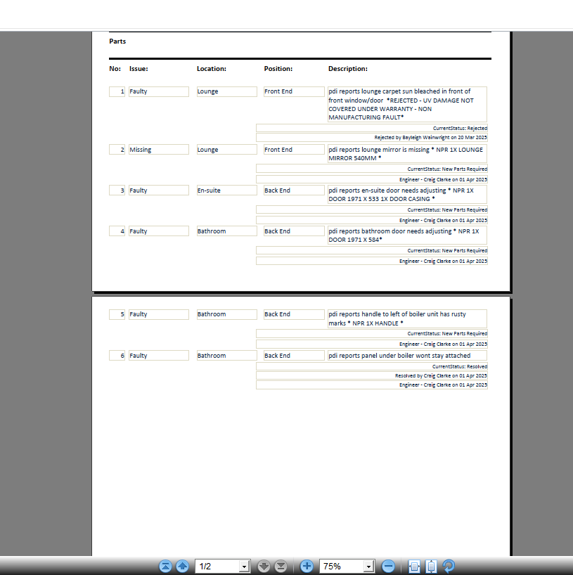 Claire Folland added a comment - Good Morning,   Claim Number: W0231938 An ABI engineer has attended your van Serial Number: 1910984 relating to your claim and has advised that a further part has now been ordered for one of the issues, this claim is not yet complete. The part will be ordered on the same claim number and will be kept open until the job has been completed. If you have any queries please contact the ABI Warranty Team. We have now ordered the below parts to address the issues you have raised on the warranty claim.   1. Item Code: 22FUR0231 x 1 Part: MIRROR: DEEP CLASSIC 540MM ROUND 2. Item Code: 18FUR0015.0533 x 1 Part: DOOR: INTERIOR 1971 X 533 3. Item Code: 18FUR0015.0584 x 1 Part: DOOR: INTERIOR 1971 X 584 4. Item Code: 24PLA0001.0585 x 1 Part: DOOR CASING SET: 585X2024 28MM 5. Item Code: 18IRN0018 x 1 Part: HANDLE: T BAR 128MM HA00001BK   If you have any further queries, Please contact us and advise of the serial number or claim number included in this email.   Kind Regards, ABI Warranty Team
