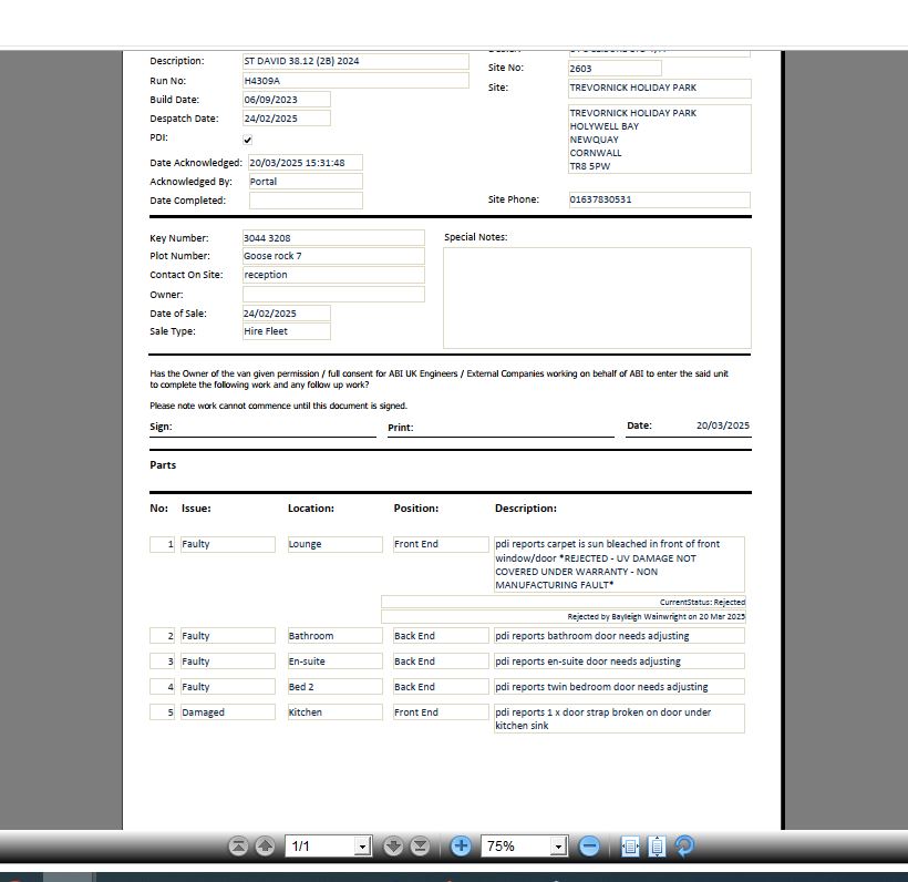 Claire Folland added a comment - Good Morning,   Claim Number: W0231940 An ABI engineer has attended your van Serial Number: 1910985 relating to your claim and has advised that a further part has now been ordered for one of the issues, this claim is not yet complete. The part will be ordered on the same claim number and will be kept open until the job has been completed. If you have any queries please contact the ABI Warranty Team. We have now ordered the below parts to address the issues you have raised on the warranty claim.   1. Item Code: 18FUR0015.0533 x 2 Part: DOOR: INTERIOR 1971 X 533 2. Item Code: 24PLA0001.0585 x 2 Part: DOOR CASING SET: 585X2024 28MM 3. Item Code: 01IRN0054 x 2 Part: STAY: FLEXIBLE STRAP 200MM   If you have any further queries, Please contact us and advise of the serial number or claim number included in this email.   Kind Regards, ABI Warranty Team