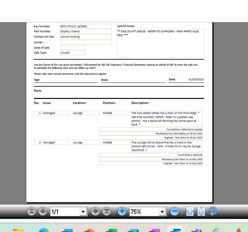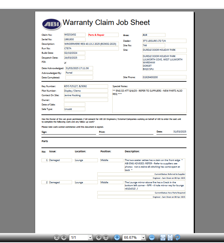 An ABI engineer has attended your van Serial Number: 1991930 relating to your claim and has advised that a further part has now been ordered for one of the issues, this claim is not yet complete. The part will be ordered on the same claim number and will be kept open until the job has been completed. If you have any queries please contact the ABI Warranty Team.