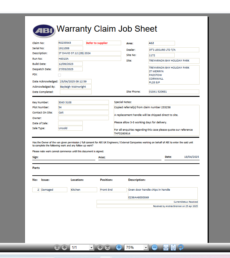 | Summary | CLONE - Fridge cupboard door and door next to it has a colour difference at the top | Oven door handle chips in handle |