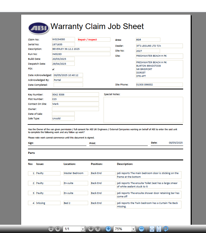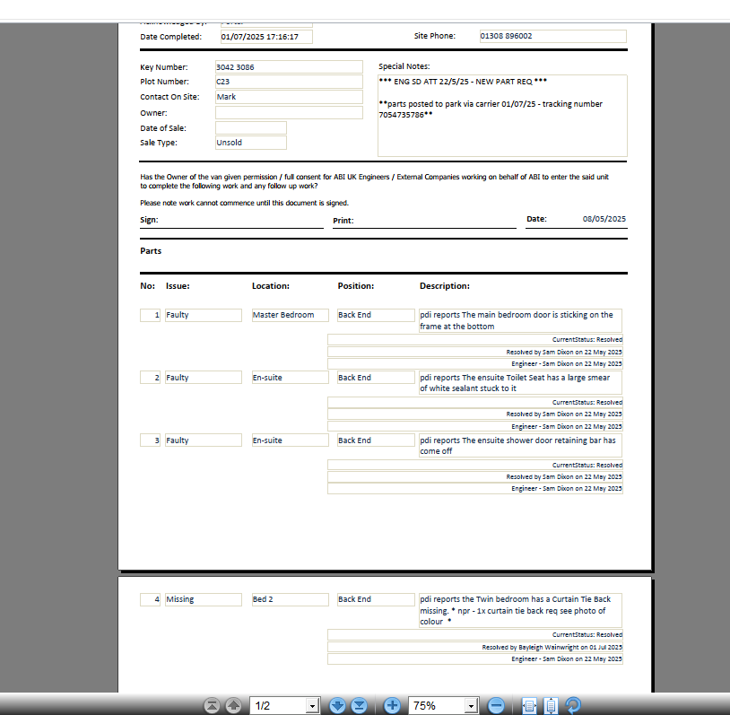 | Status | Parts Recieved [ 10003 ] | Worksheet Issued [ 10004 ] |