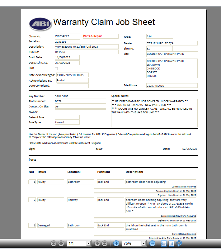 An ABI engineer has attended your van Serial Number: 2031191 relating to your claim and has advised that a further part has now been ordered for one of the issues, this claim is not yet complete. The part will be ordered on the same claim number and will be kept open until the job has been completed. If you have any queries please contact the ABI Warranty Team.