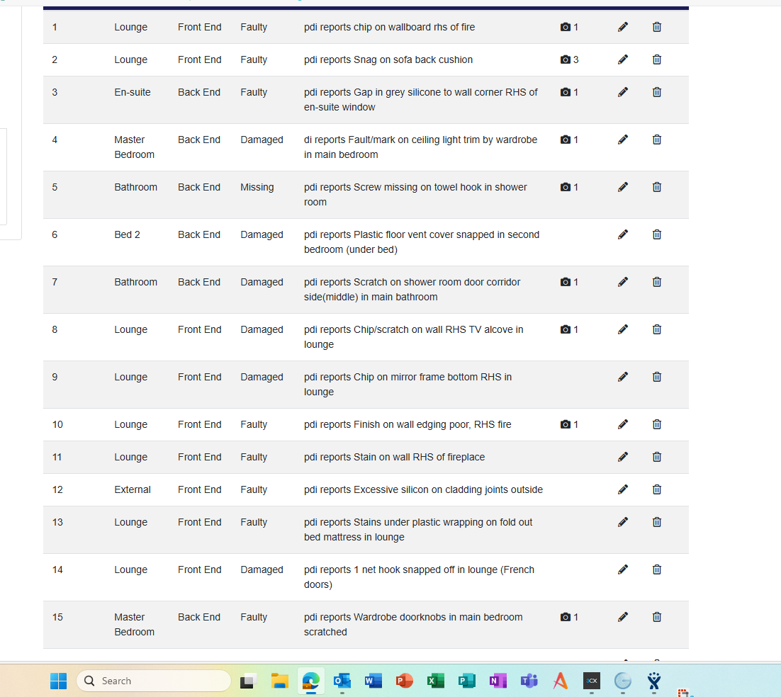 | Summary | CLONE - pdi reports Loose front corner section to external cladding, causing vibration noise. | pdi reports Chip/gauge in lino floor in main bathroom |