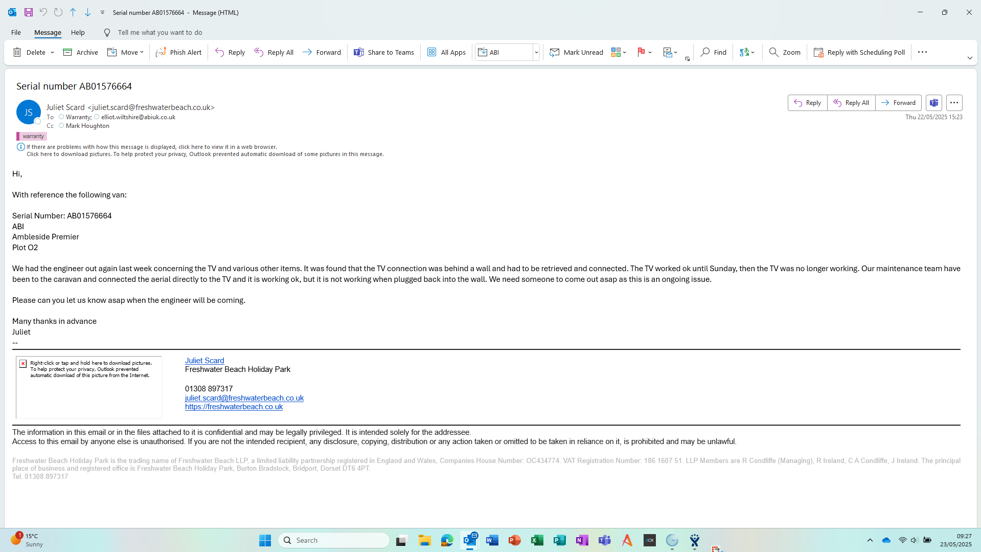 We had the engineer out again last week concerning the TV and various other items. It was found that the TV connection was behind a wall and had to be retrieved and connected. The TV worked ok until Sunday, then the TV was no longer working. Our maintenance team have been to the caravan and connected the aerial directly to the TV and it is working ok, but it is not working when plugged back into the wall. We need someone to come out asap as this is an ongoing issue.