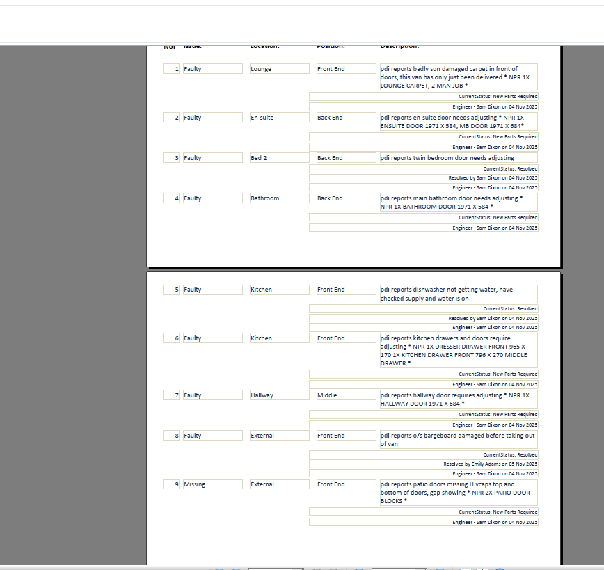 Claire Folland added a comment - Good Afternoon,   Claim Number: W0240487 An ABI engineer has attended your van Serial Number: 1576675 relating to your claim and has advised that a further part has now been ordered for one of the issues, this claim is not yet complete. The part will be ordered on the same claim number and will be kept open until the job has been completed. If you have any queries please contact the ABI Warranty Team. We have now ordered the below parts to address the issues you have raised on the warranty claim.   1. Item Code: 19FLR0025.4000 x 4 Part: CARPET: `BALTA` SHEPHERD 745 2. Item Code: 18FUR0015.0584 x 2 Part: DOOR: INTERIOR 1971 X 584 3. Item Code: 18FUR0015.0684 x 2 Part: DOOR: INTERIOR 1971 X 684 4. Item Code: PBU21021 x 1 Part: SHAKER DOOR: 269 X 796 X 19MM 5. Item Code: PCB21003 x 1 Part: SHAKER DOOR: 171 X 963 X 19MM 6. Item Code: REPAIR SEE MIKE/DEAN x 2 Part: PATIO H BLOCK   If you have any further queries, Please contact us and advise of the serial number or claim number included in this email.   Kind Regards, ABI Warranty Team