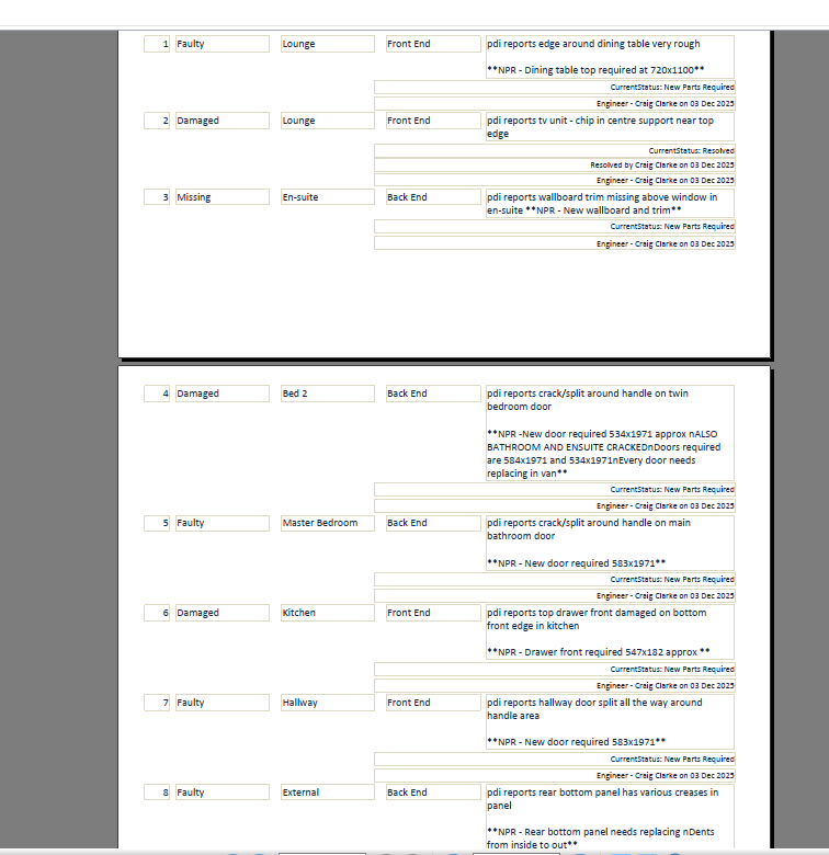 Claire Folland added a comment - Good Morning,   Claim Number: W0241392 An ABI engineer has attended your van Serial Number: 2031298 relating to your claim and has advised that a further part has now been ordered for one of the issues, this claim is not yet complete. The part will be ordered on the same claim number and will be kept open until the job has been completed. If you have any queries please contact the ABI Warranty Team. We have now ordered the below parts to address the issues you have raised on the warranty claim.   1. Item Code: REPAIR TOLEDO x 1 Part: DINING TABLE 2. Item Code: 22TSM0002.0040 x 1 Part: WRAPROUND: 40MM 3.6MM BALWEN TAUPE 8FT 3. Item Code: 22TSM0001.2440 x 1 Part: VINYL PLY: 3MM BALWEN TAUPE 4. Item Code: 24FUR0067.0584 x 3 Part: DOOR: INTERIOR 1971 X 584 5. Item Code: 24FUR0067.0533 x 2 Part: DOOR: INTERIOR 1971 X 533 6. Item Code: PBU25022.509 x 1 Part: TRIO DRAWER: 182 X 546 X 19MM 7. Item Code: 24MET0301.EL x 1 Part: 3655 X 790 CHAMPAGNE LOW GLOSS 8. Item Code: REPAIR SEE MIKE/DEAN x 1 Part: SILVER SERIAL STICKER   If you have any further queries, Please contact us and advise of the serial number or claim number included in this email.   Kind Regards,