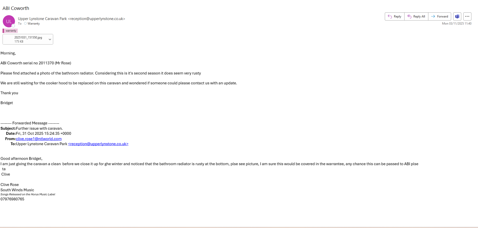 Claire Folland added a comment - Good Morning,   Claim Number: W0241604 We have now ordered the below parts to address the issues you have raised on the warranty claim.   1. Item Code: 99HTG2955 x 1 Part: RADIATOR: `MORCO` 600H X 500L   If you have any further queries, Please contact us and advise of the serial number or claim number included in this email.   Kind Regards, ABI Warranty Team