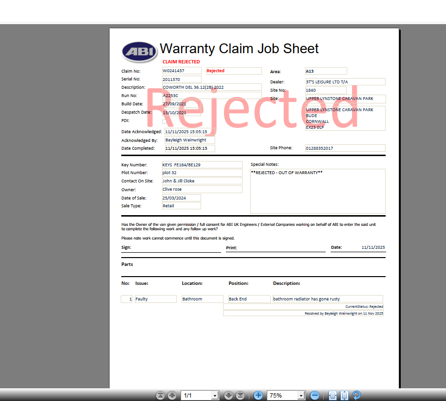 Claire Folland added a comment - Hi Claire, Unfortunately, this isn’t covered under warranty so has been rejected. I’m aware this owner can be difficult at times so if it would make your life easier, please let us know and we can arrange parts only to site if you can arrange fitting. ***** have asked ABI if they can send one out