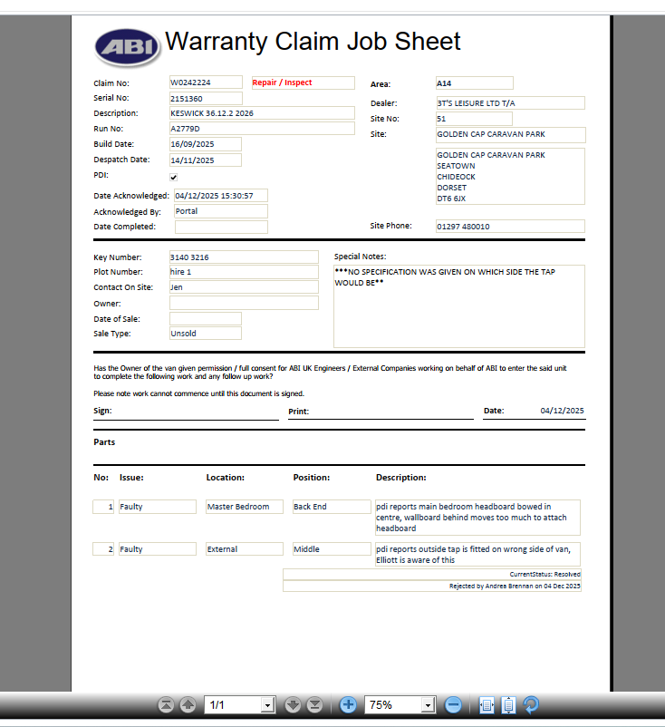 | Summary | CLONE - pdi reports main bedroom headboard bowed in centre, wallboard behind moves too much to attach headboard | pdi reports outside tap is fitted on wrong side of van |