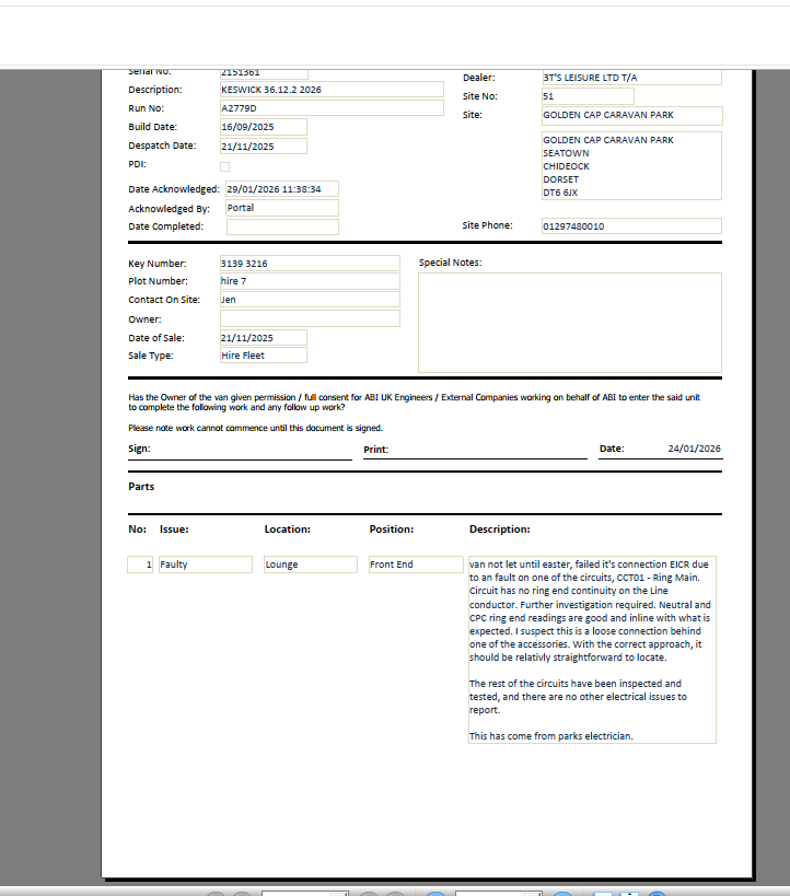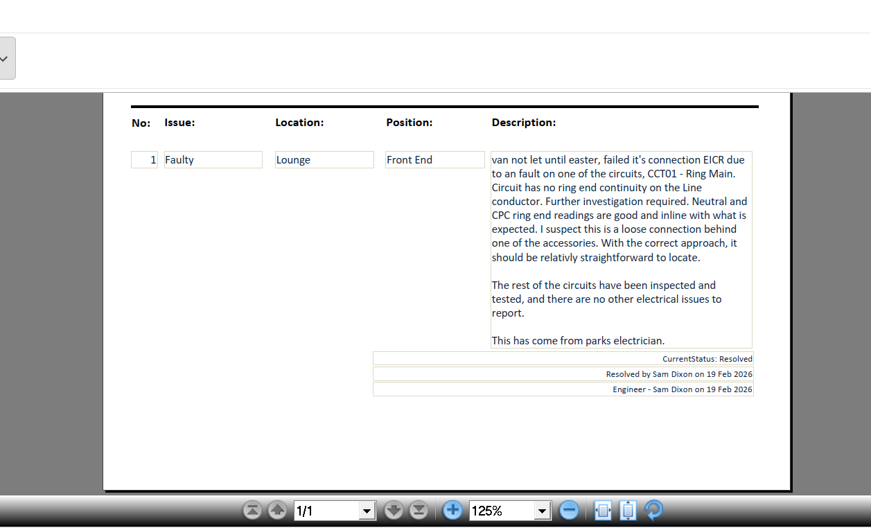 CCT01 - Ring Main. Circuit has no ring end continuity on the Line conductor. Further investigation required. Neutral and CPC ring end readings are good and inline with what is expected. I suspect this is a loose connection behind one of the accessories. With the correct approach, it should be relativly straightforward to locate.