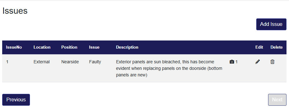 | Issue Type | Internal Issues (1 Week) [ 17 ] | Exterior Panels (8 Weeks) [ 26 ] |