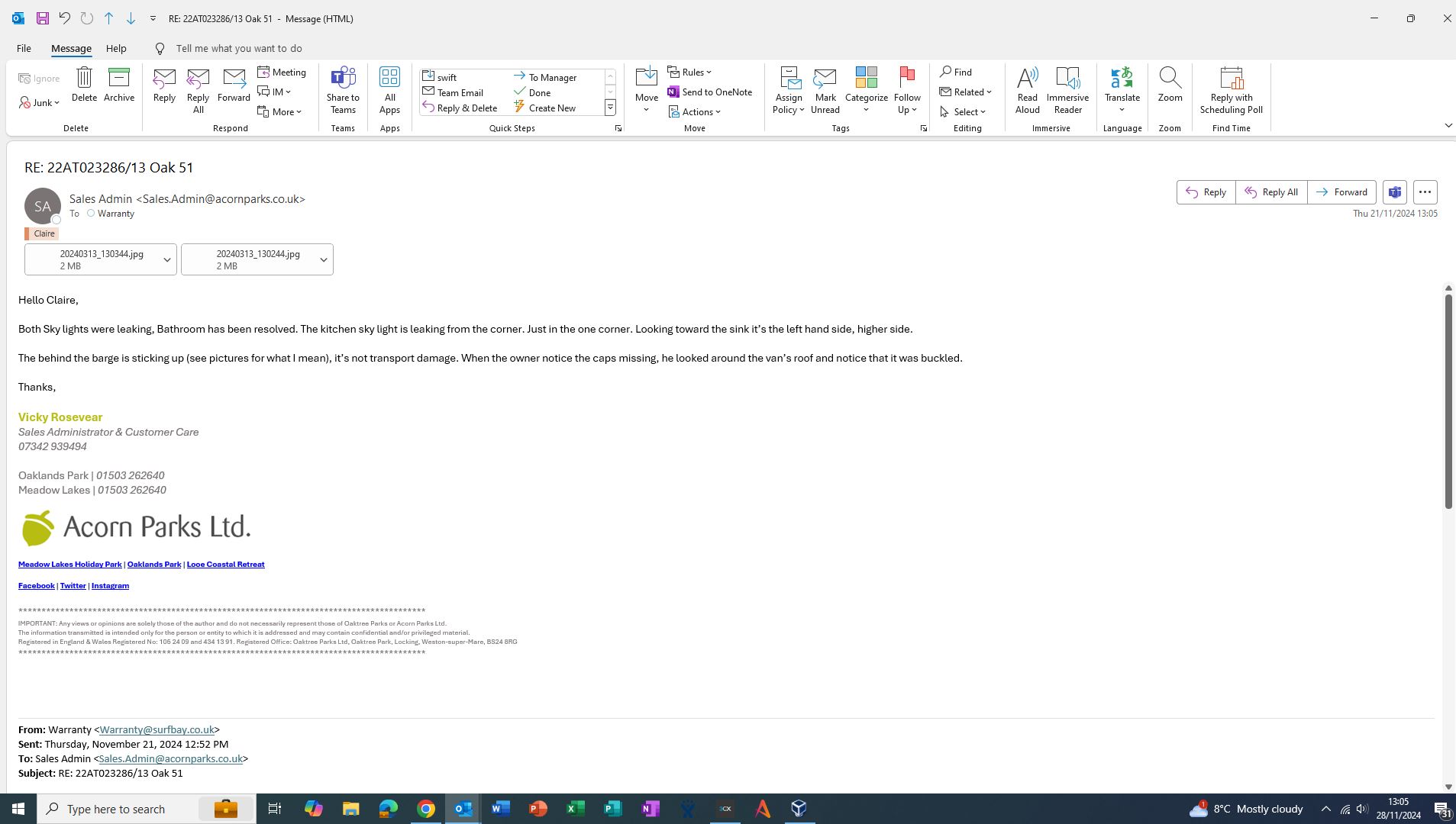 Claire Folland added a comment - Hi Claire, Stalco are re-attending this one to repair the leak in the velux window and replacing the bargeboard. We’re just waiting for the Bargeboard to come in. Kind regards Karen