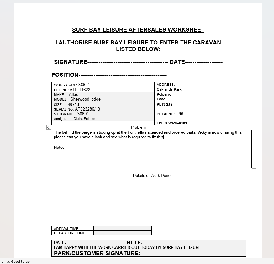Claire Folland added a comment - complete by steve 30-5-25, customer was staying in van