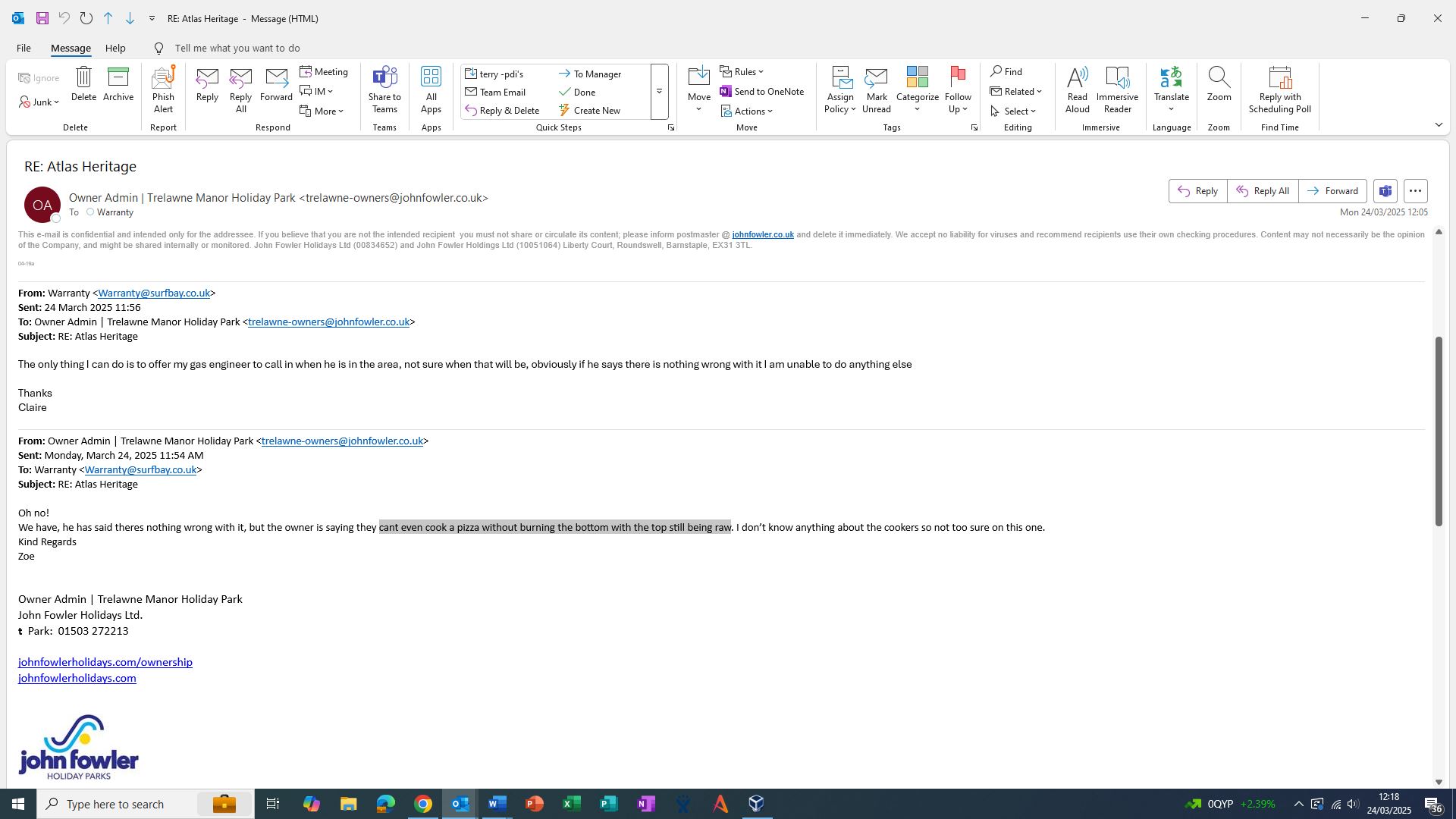 Claire Folland added a comment - received email from park, they would like a 2nd opinion if possible, did not realise atlas had gone into administration, offered steve to have a look when he is in the area,