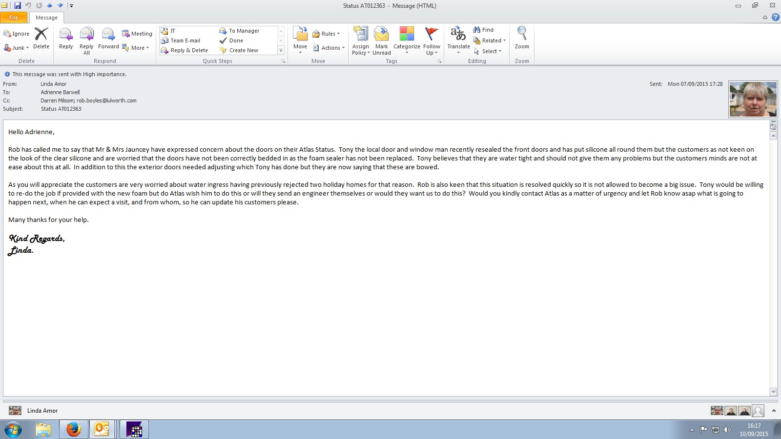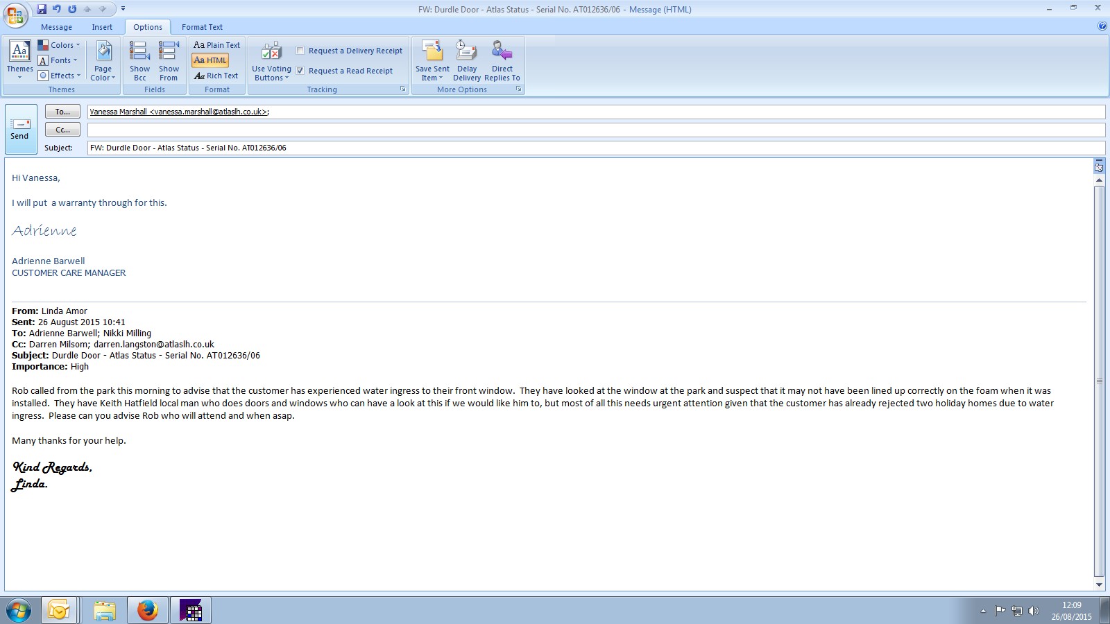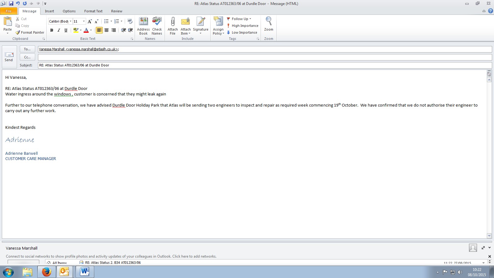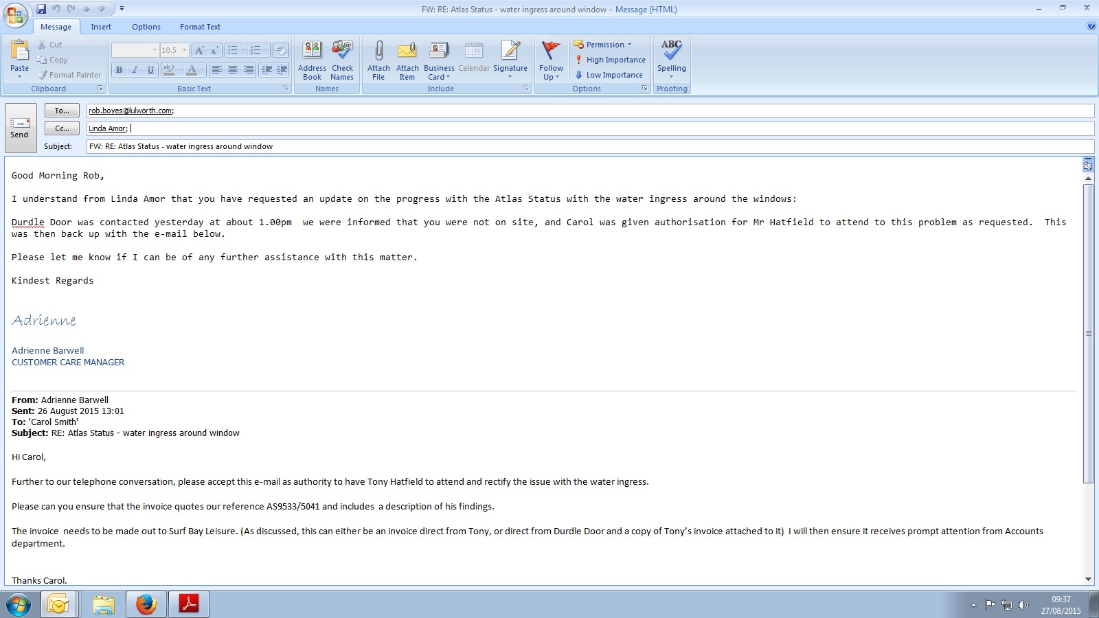 I have spoken to Vanessa at Atlas she has advised that Ellbee went out before and advised that this ingress was due to extreme whether conditions and that there was nothing wrong with their product. Vanessa has advised them that there is an issue with the window and they have agreed to re-attend this week.