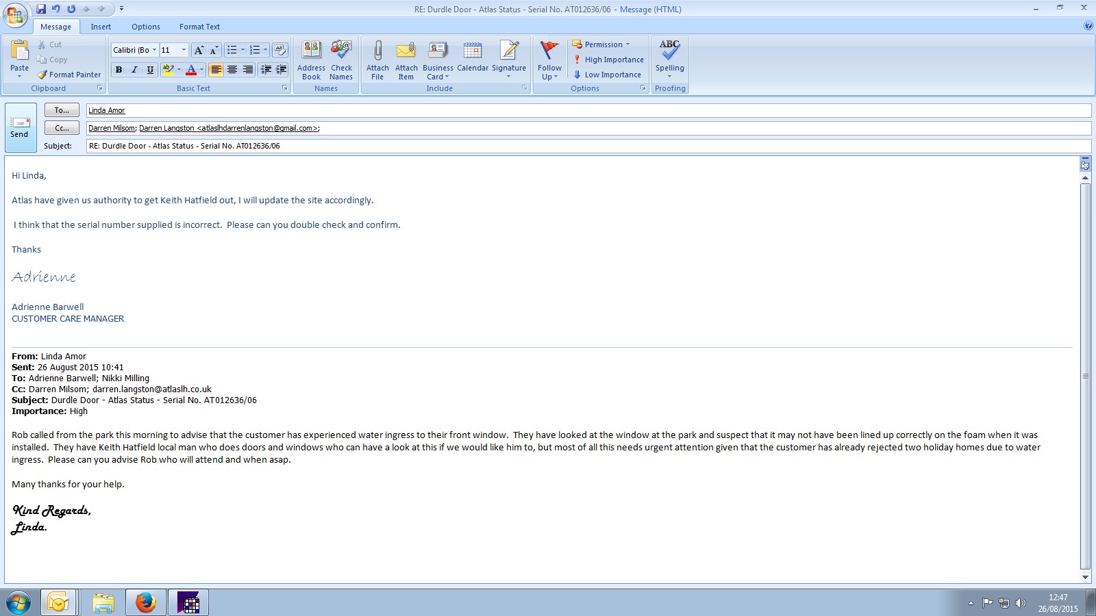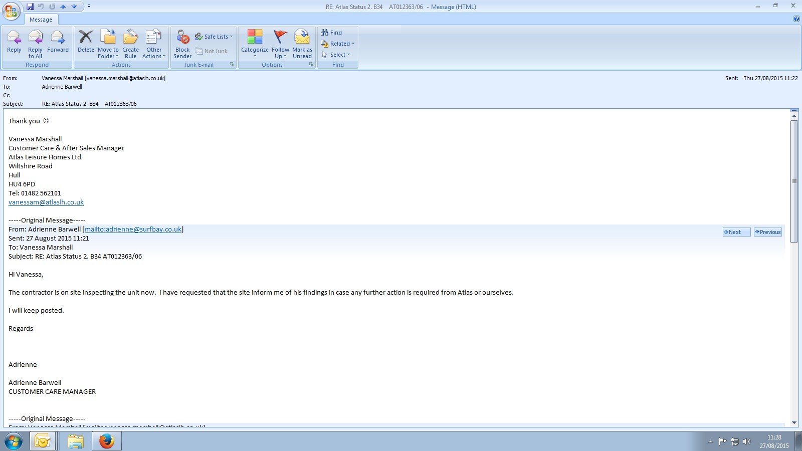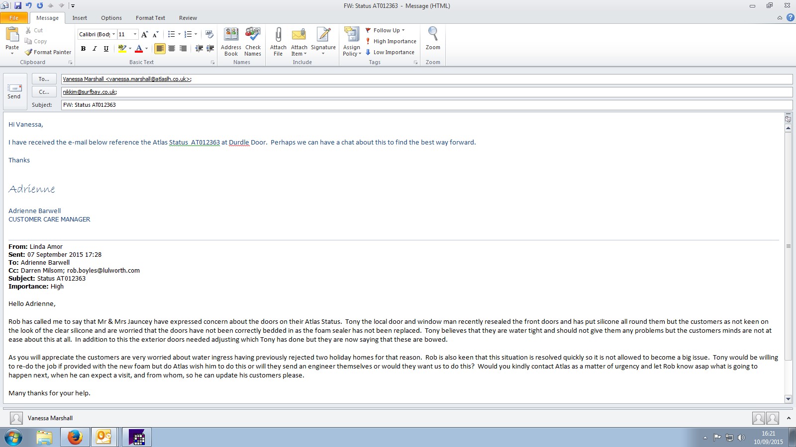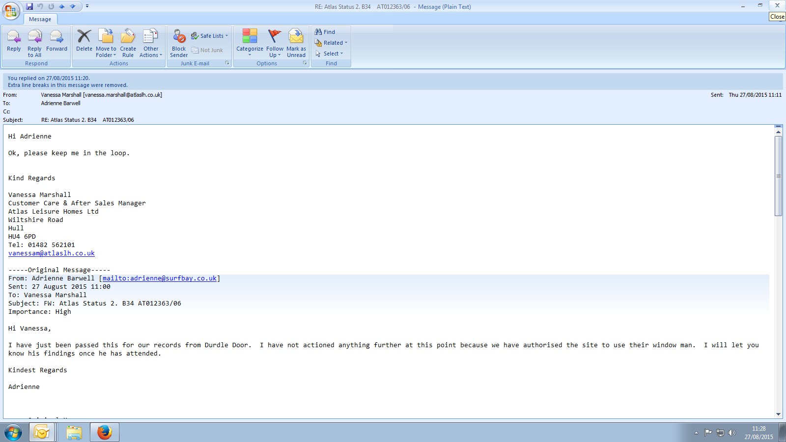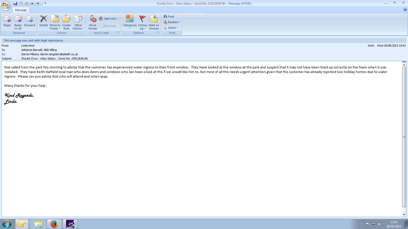 I have spoken to Vanessa at Atlas she has advised that Ellbee went out before and advised that this ingress was due to extreme whether conditions and that there was nothing wrong with their product. Vanessa has advised them that there is an issue with the window and they have agreed to re-attend this week.