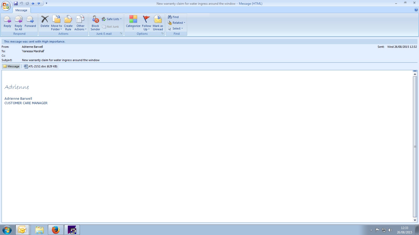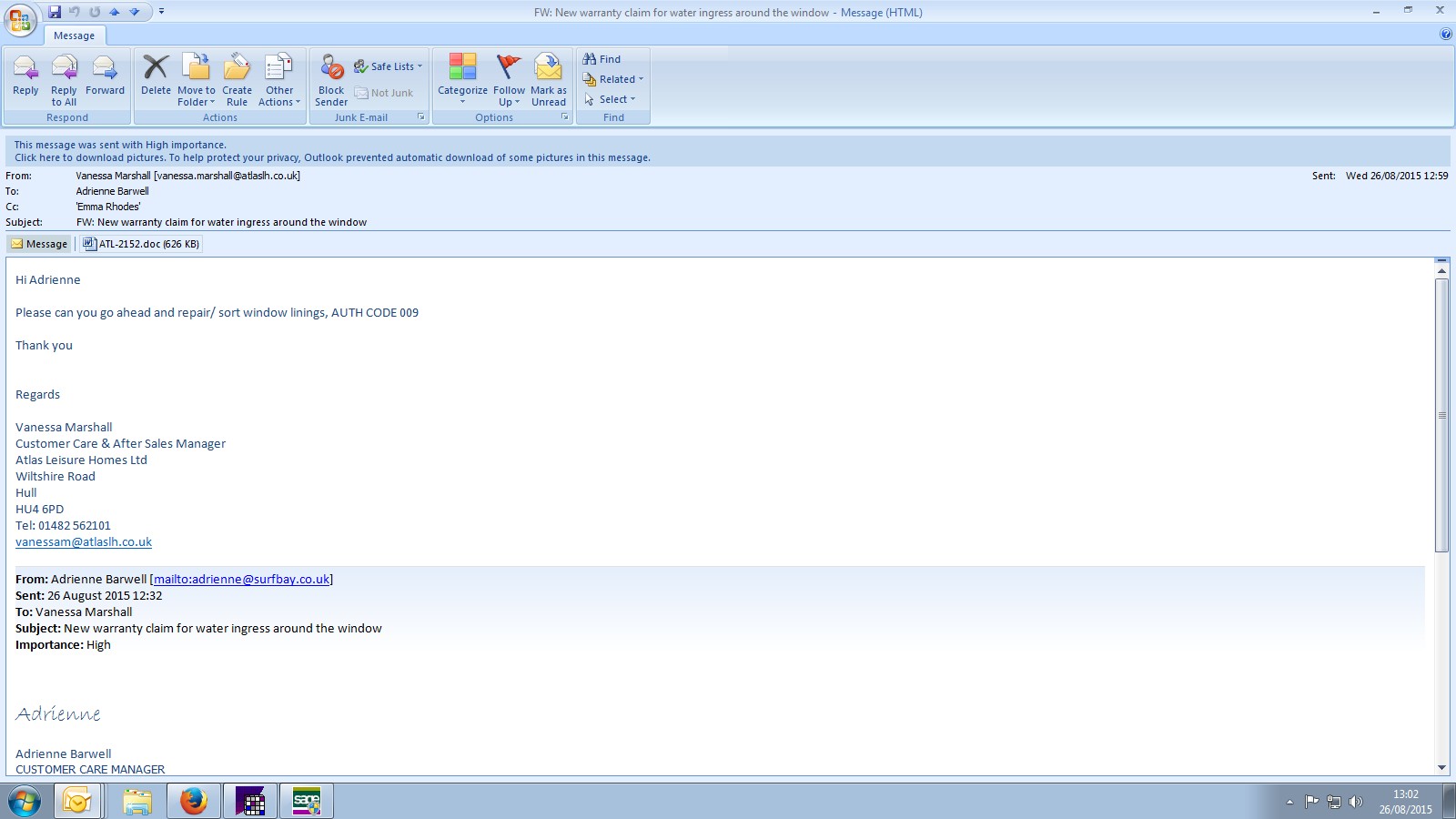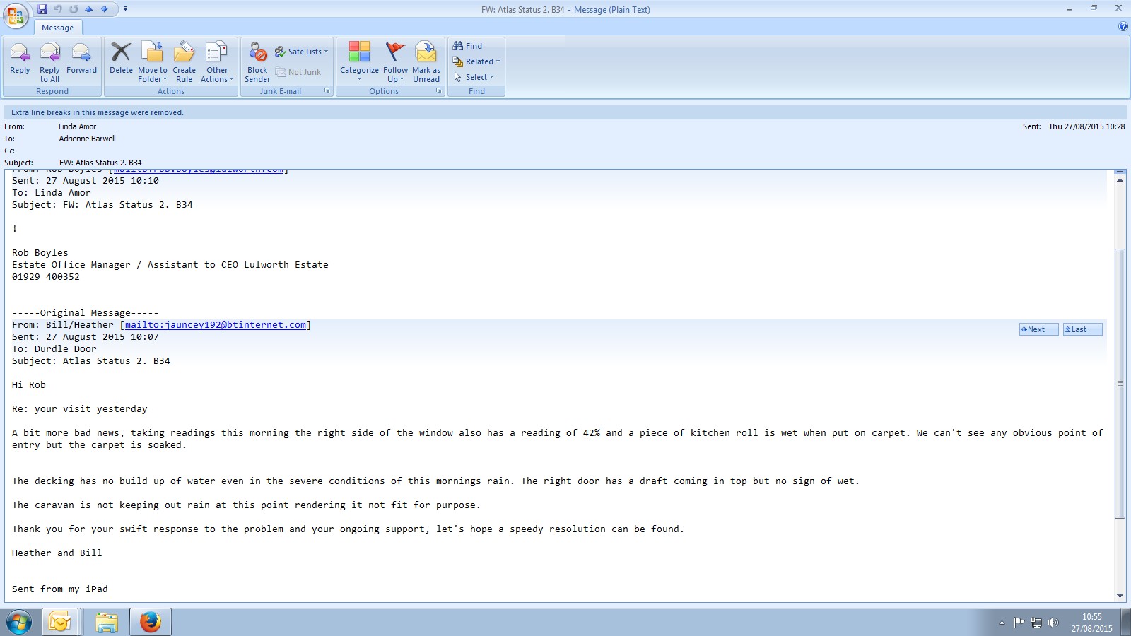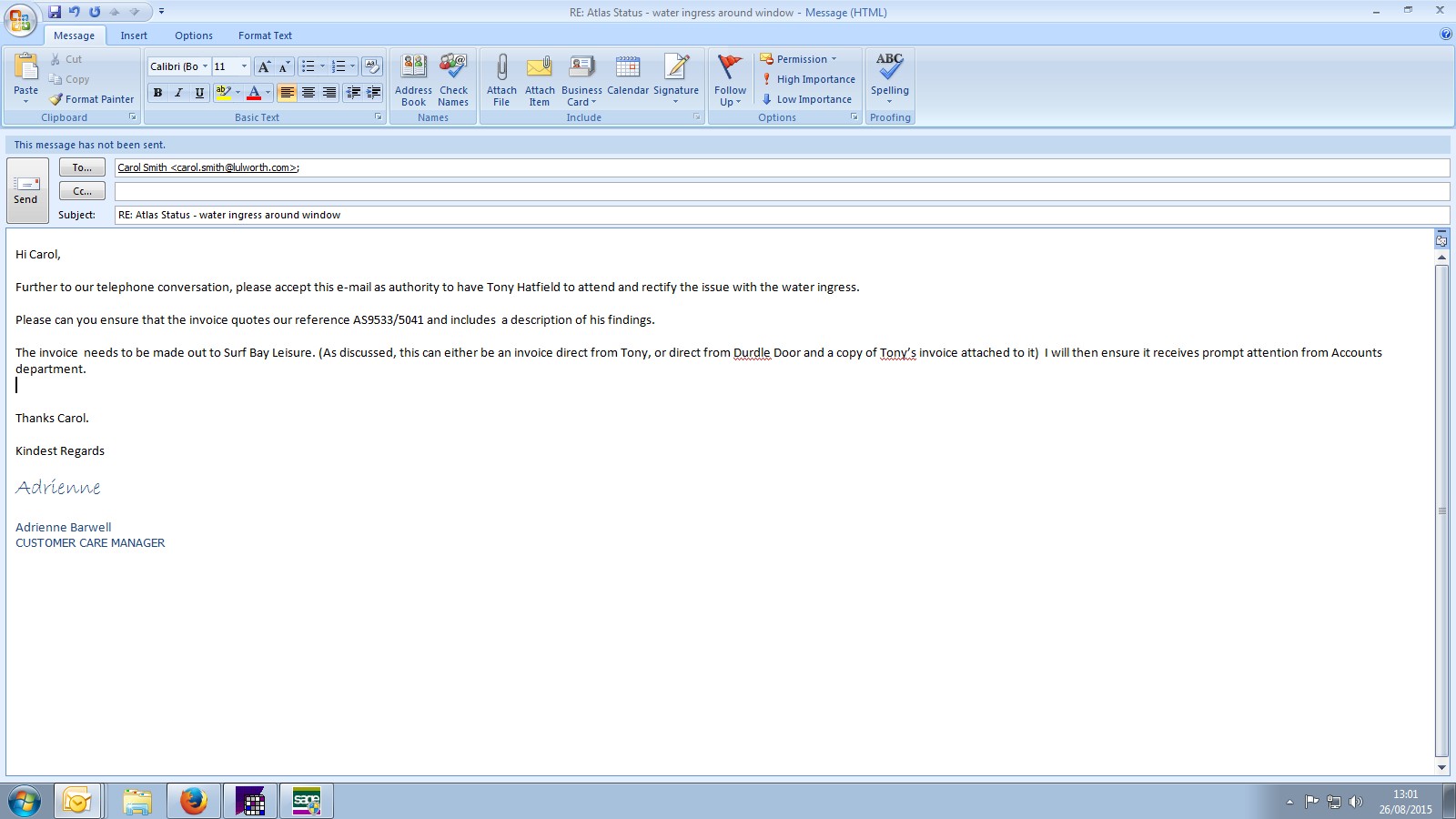 I have spoken to Vanessa at Atlas she has advised that Ellbee went out before and advised that this ingress was due to extreme whether conditions and that there was nothing wrong with their product. Vanessa has advised them that there is an issue with the window and they have agreed to re-attend this week.