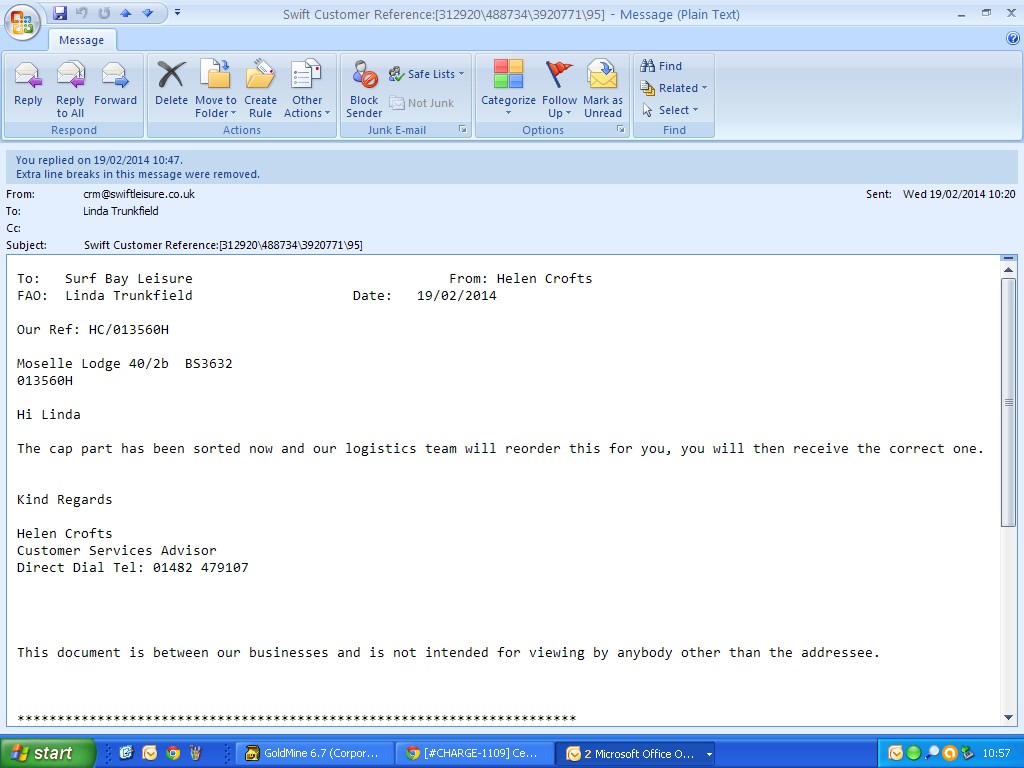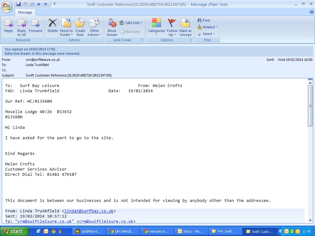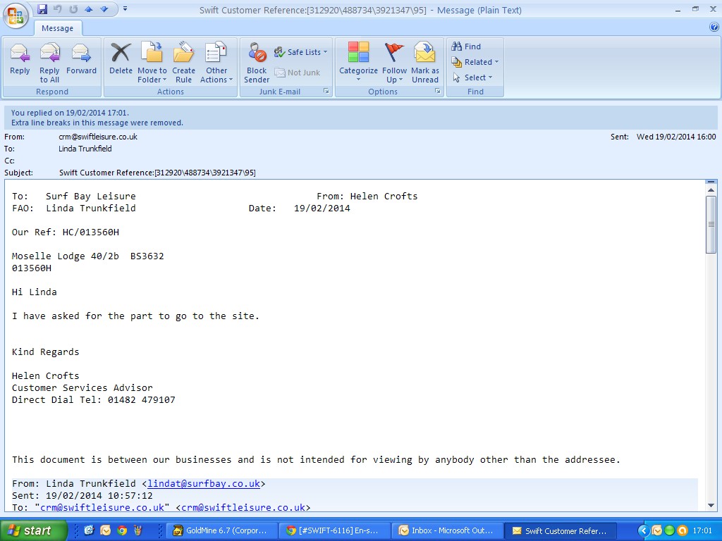 Linda Trunkfield (Inactive) added a comment - Swift have finally come back to me to say that they have sorted the part number out and will order the part, I have e-mailed back asking that they send it direct to site and that I would like it f-o-c due to all the messing about.