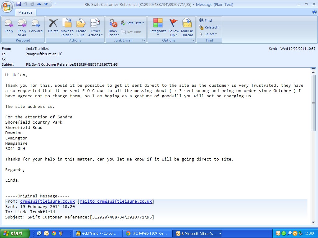Claire Folland added a comment - Part arrived on the swift delivery with both our and the parks address on it, the swift driver agreed to deliver it to park