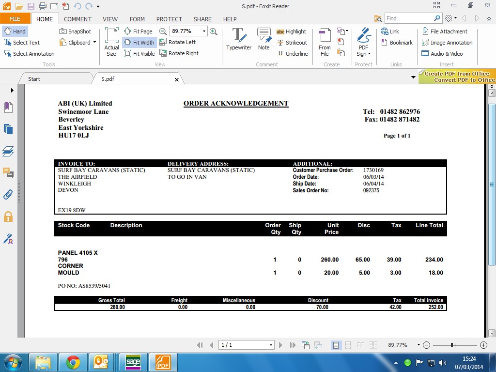 Lorraine Pryor (Inactive) added a comment - Tim from Abi called to say that he has spoken or been at the park. He said that the park never ask us to get this FOC? I said that my college has e-mailed me to say that they have asked for that. We never received a quote from Dan, with he said he sent to us, when I did get the quote I e-mailed it to the park and they have never replied to say they want us to order it. Anyway Tim now wants me to order it and charge the park. he said panel but we have a note that they ask for panel / corner capping so I will order both parts. He said that he has told them he will get it put in a van that Linda Amor has order so they don't have to pay the freight charges! I have send the order over to Dan asking him to order it with p/o no AS8539/5041 and that Tim will sort out where/what its to be put into?