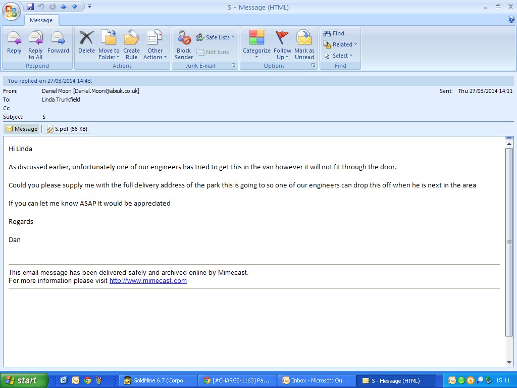 Dan e-mailed me back to say that they had tried to get the panel in the van but it would not fit so they are going to get their engineer to deliver it to the park - I sent an e-mail with the parks full address and e-mailed Linda Amor to advise her.