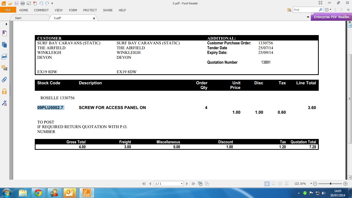| Order No | 13891 quote on,y as of 30.07.14 |