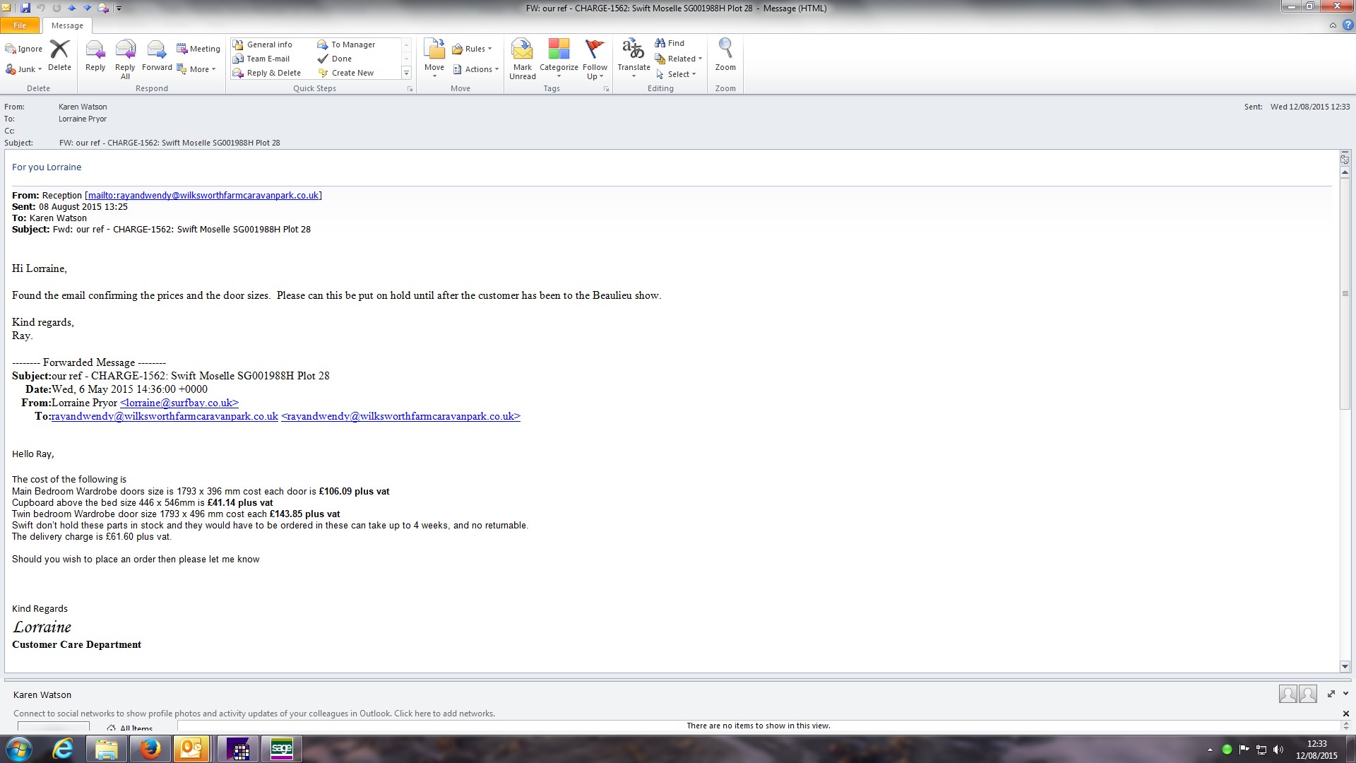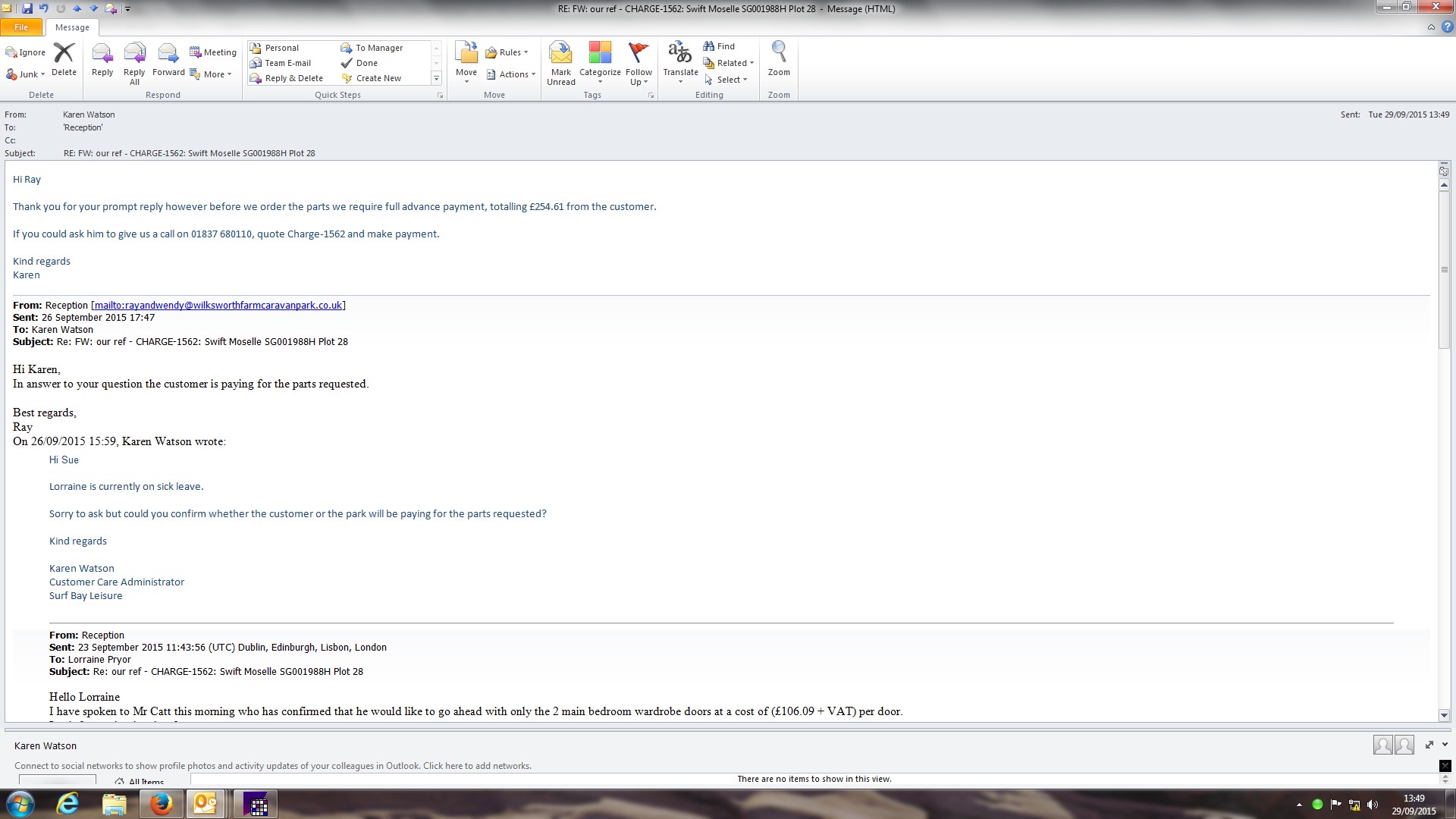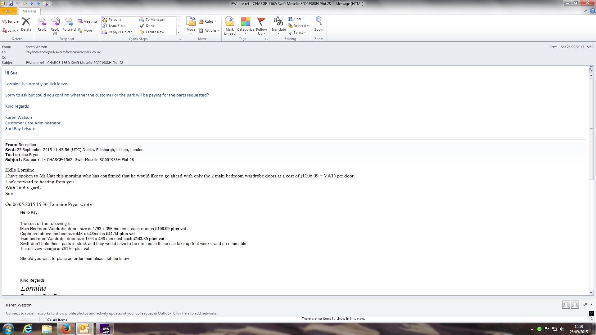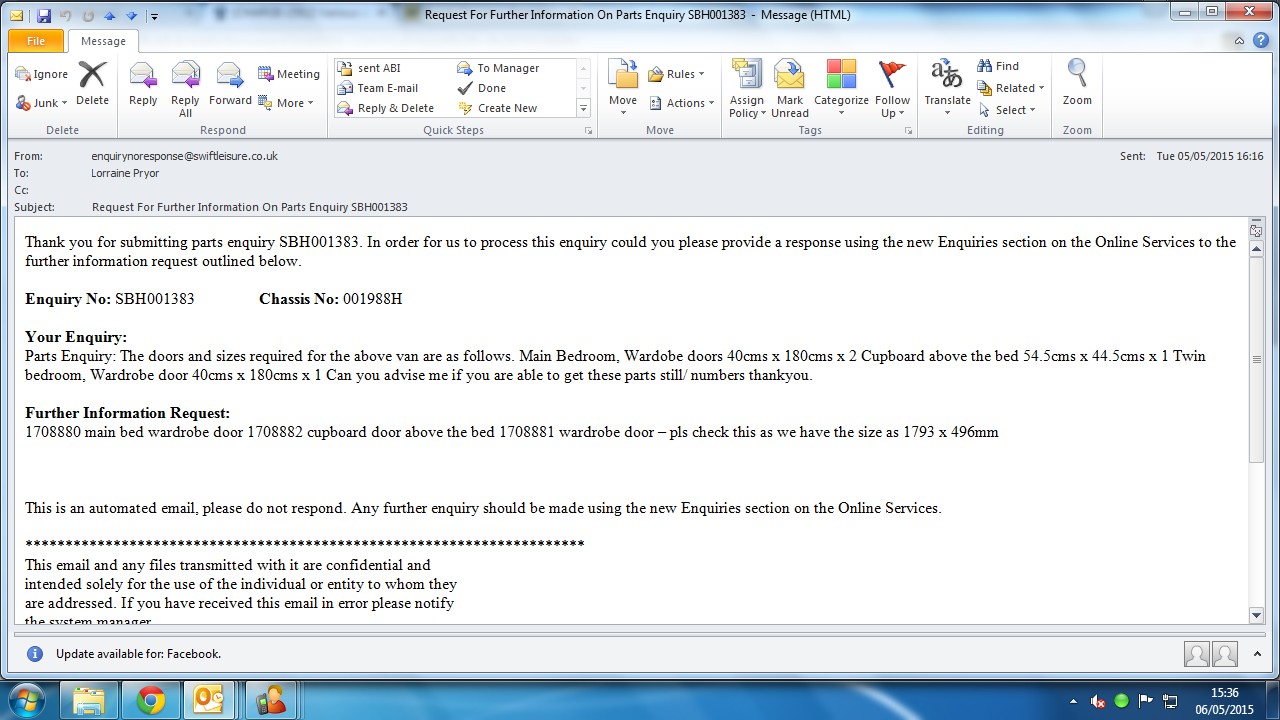| Description | Park have called to advise the customer has received a quote from us to repair the twin bedroom window, since he has had the van the window has leaked, the customer does not understand why he should pay for this to be repaired, will submit into swift |