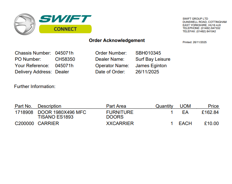 Parts enquiry submitted to Swift.