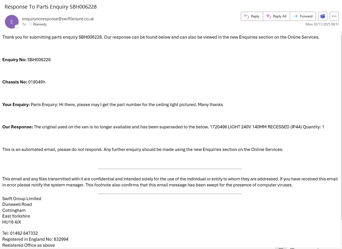 Parts enquiry submitted to Swift.