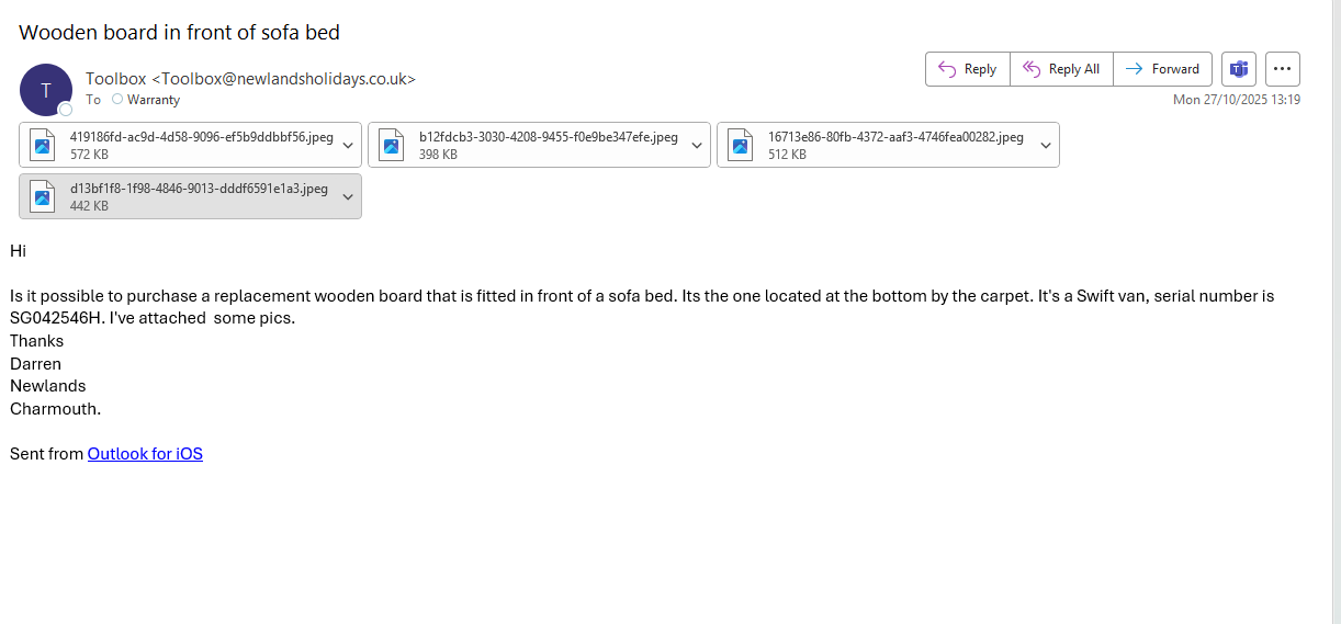 James Eginton added a comment - Darren at the park has advised not both parts of sofa required, only front. Have checked with Duncan, E131269 is the wooden board required (where sofa bed pulls out)