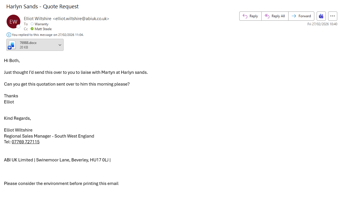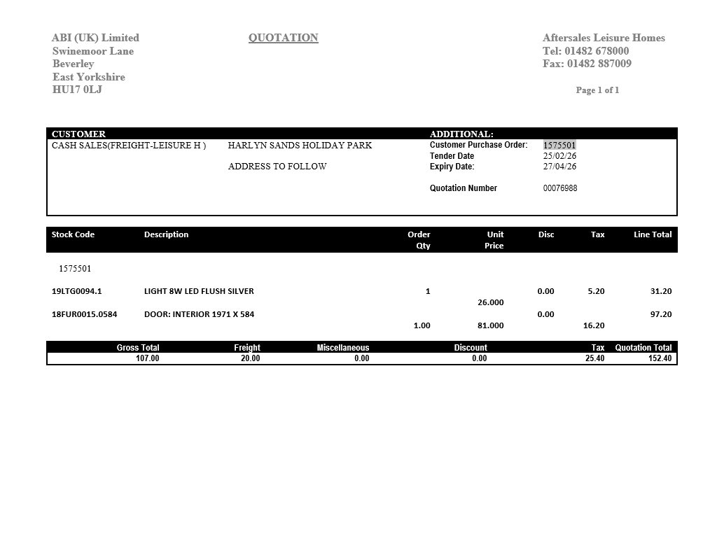 James Eginton added a comment - Door only quote accepted, have advised ABI to proceed, direct delivery as well.