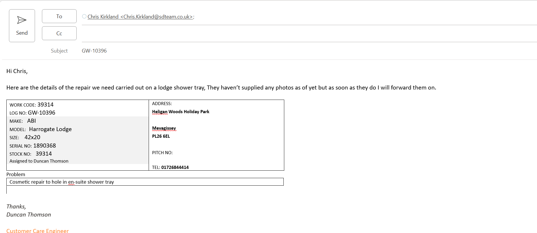 | Description | Matt Steele has request an emergency visit to repair hole in en-suite shower tray |