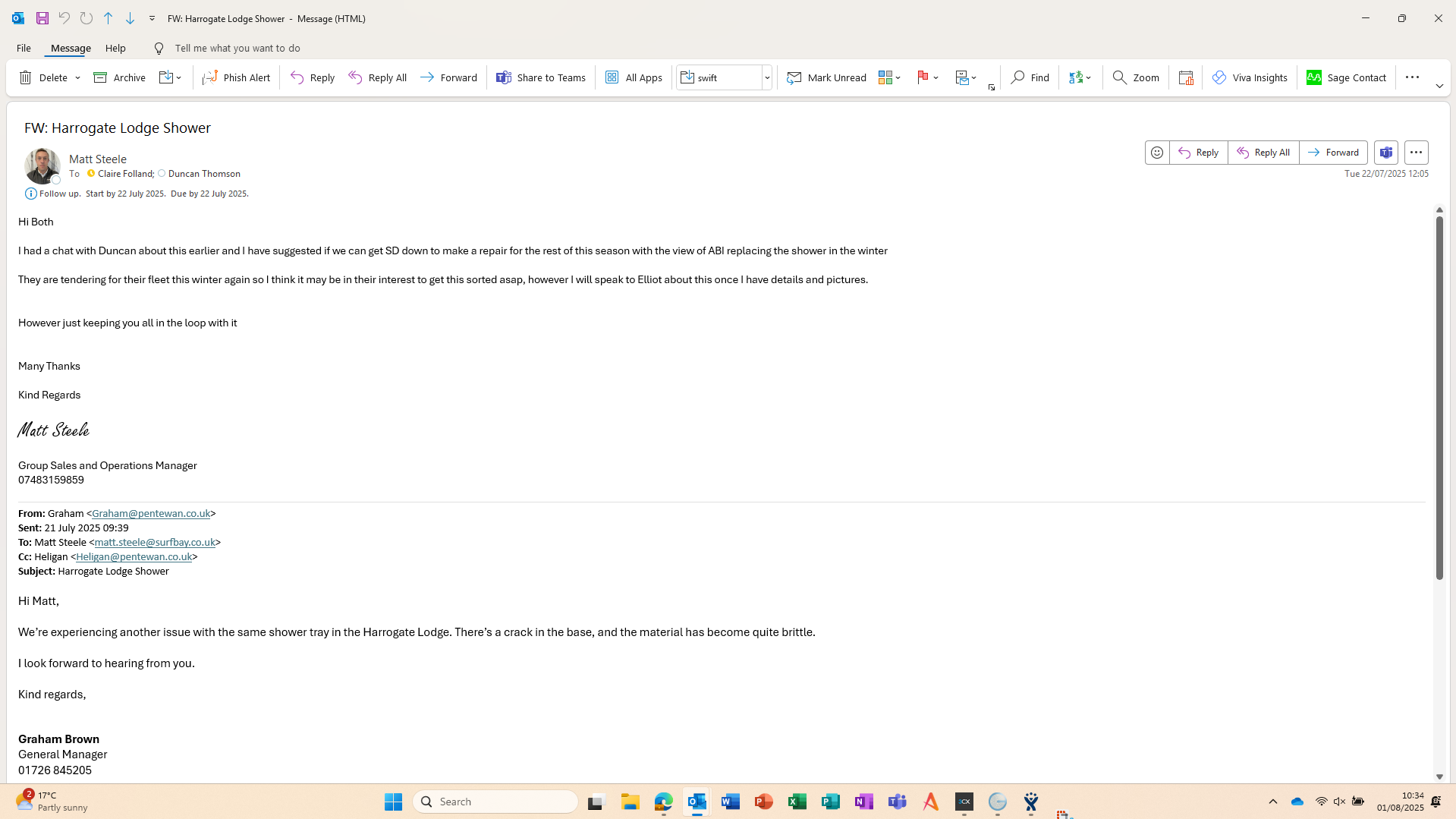 Matt Steele has request an emergency visit to repair hole in en-suite shower tray