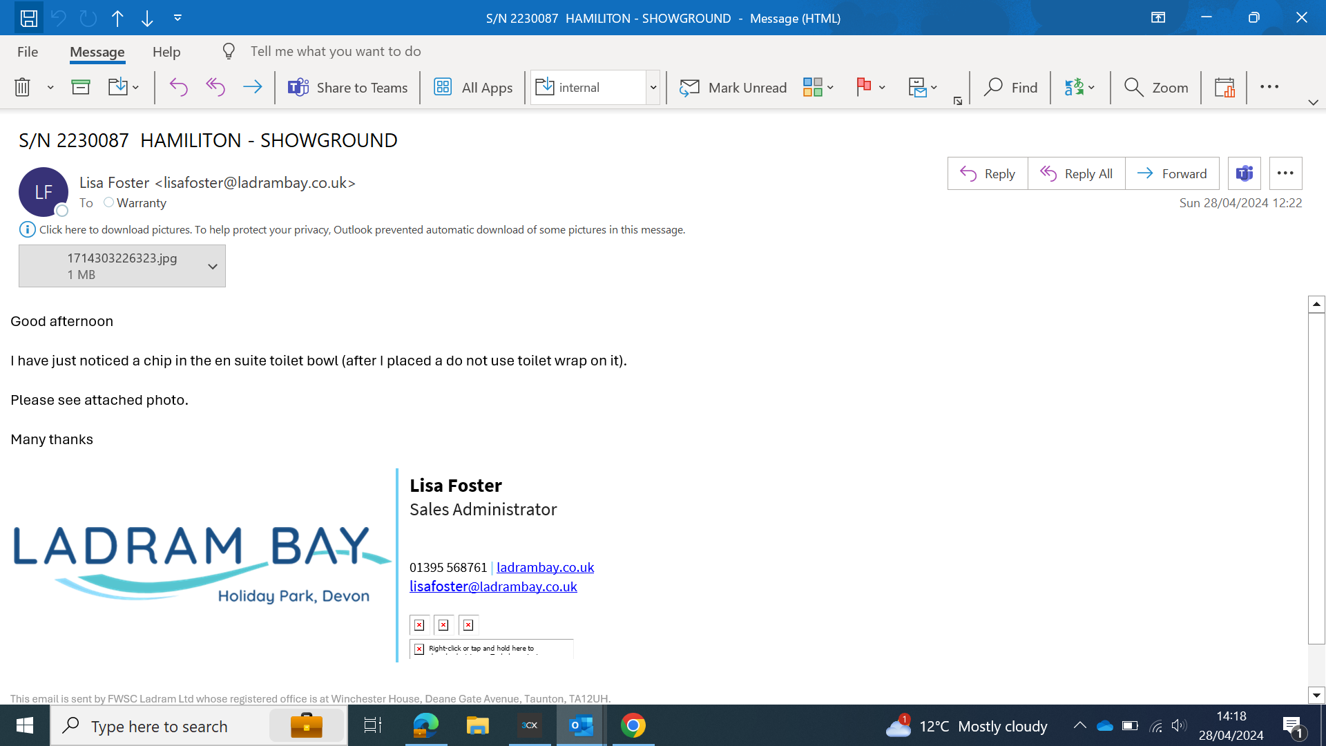 park have just noticed a chip in the en suite toilet bowl (after they placed a do not use toilet wrap on it).