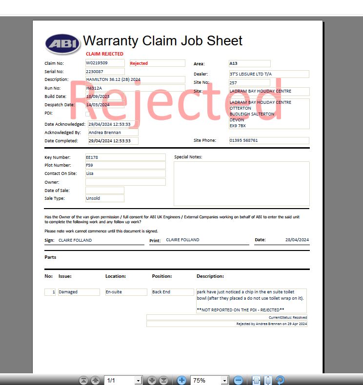 Claire Folland added a comment - ABI have rejected claim, not picked up on pdi
