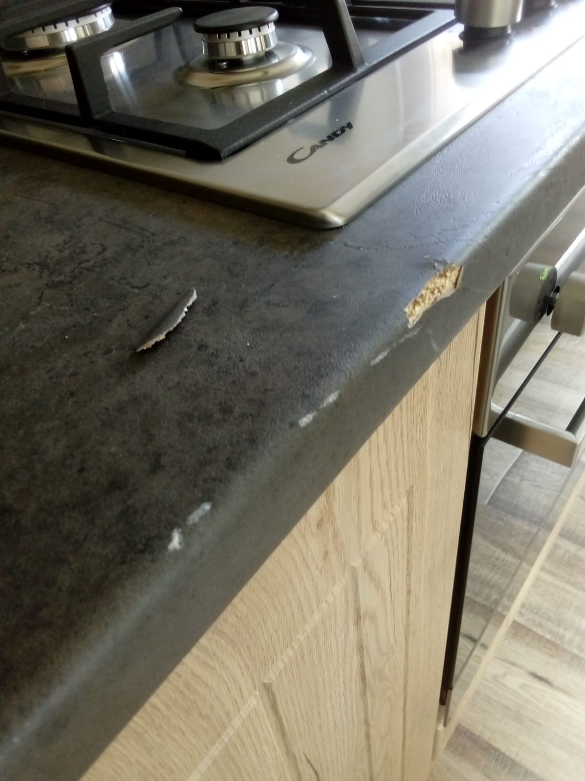 Matt has spoken to me about this one and has agreed to fix this so we are going to try a new repair company to see if they can repair the worktop (Snag Doctors) Matt to arrange, I will place a new Microwave on order to be delivered to Winkleigh and Matt is happy to attend and fit when he is next down and the floor I have already made better and will currently leave this.