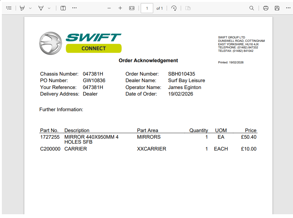 James Eginton added a comment - - edited Previous mirror was damaged when engineer went to fit on site. Have ordered new mirror as goodwill, as Swift rejected replacement due to time frame. SWIFT-36041 was original warranty case.