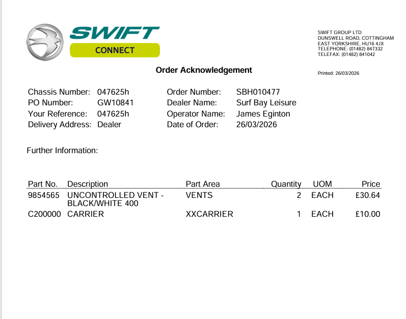 Parts ordered