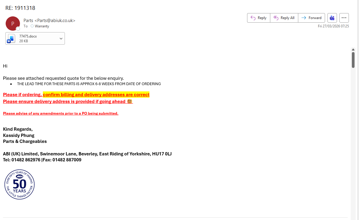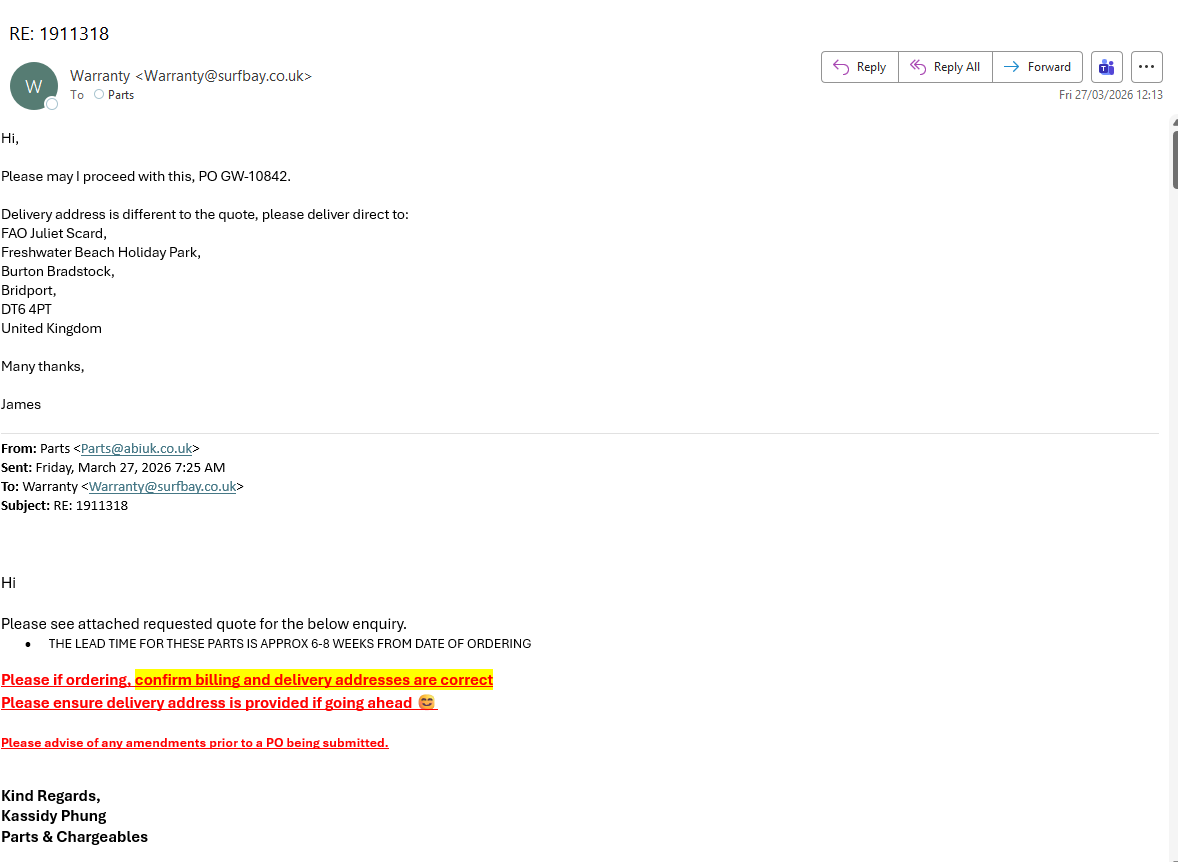 Parts ordered