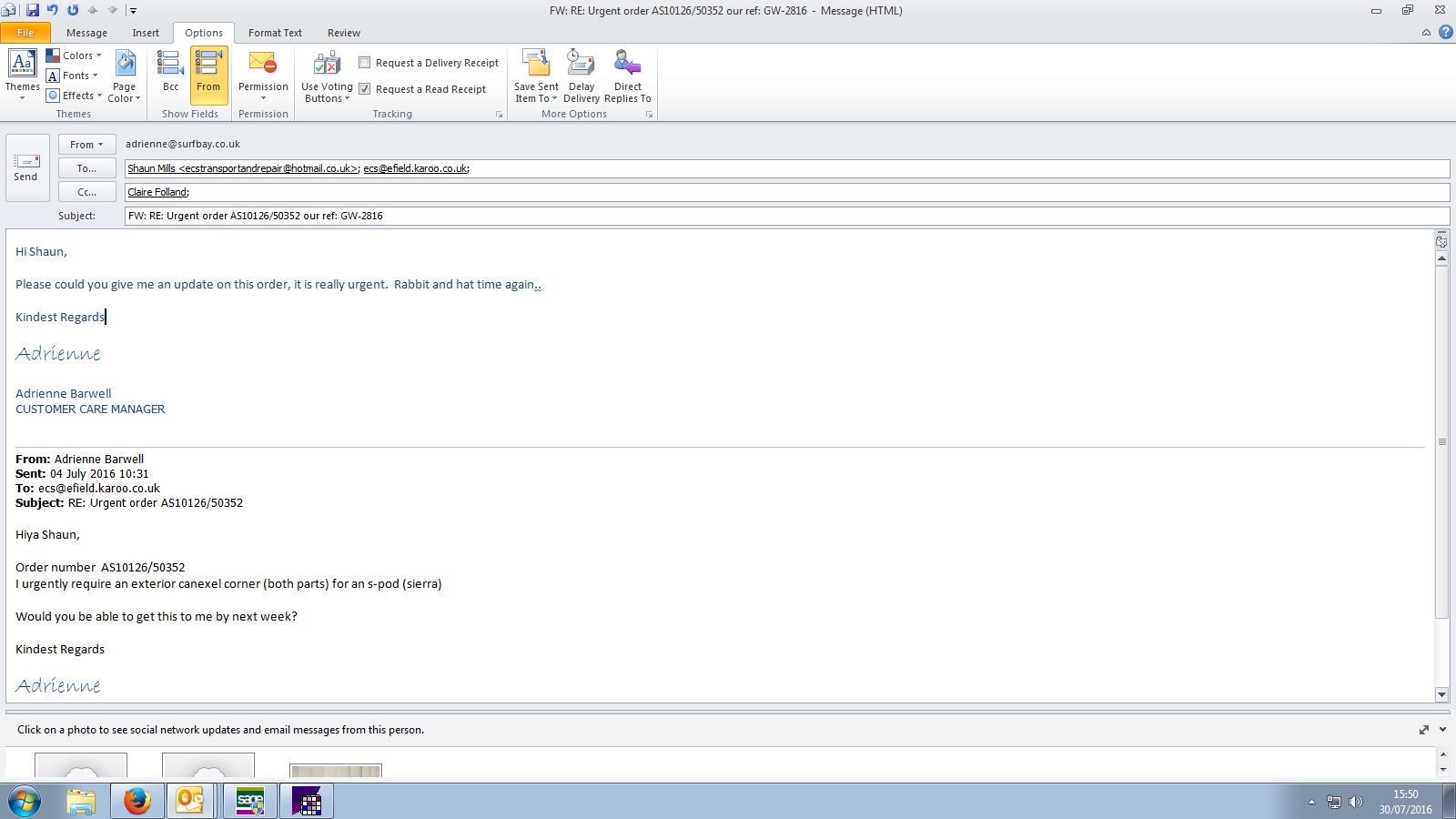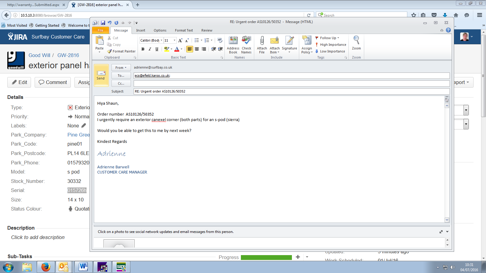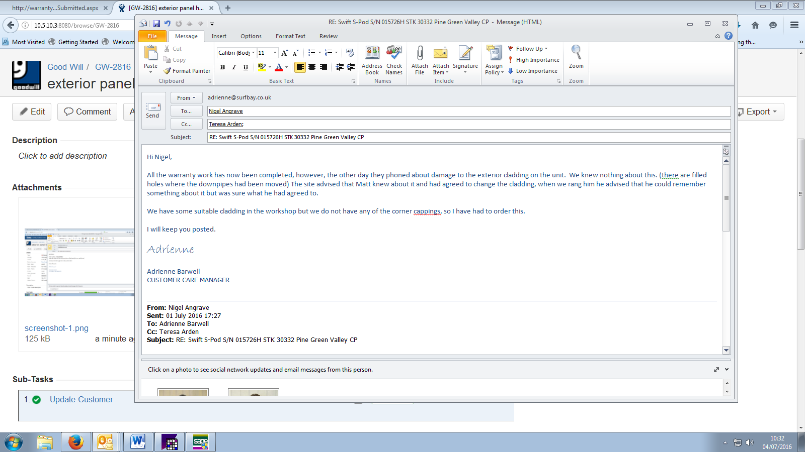 Carol has advised Surf bay have agreed to this, advised i would look into this and call her back, spoke to Ade, she was not aware of this, phoned Craig, he has had a look at it this morning and he thinks someone has fitted a downpipe in the wrong place, so they have moved the downpipe and waxed in the holes, he does not think this will be covered under warranty,