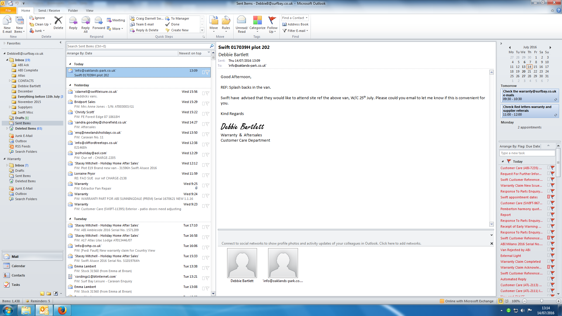 Debbie Bartlett (Inactive) added a comment - I have spoken to Craig the swift engineer and he has advised he is due to attend park on Thursday. He is going to call to confirm this on Wednesday as he has a rush job on with Andy and this he changed his weeks scheduling. I have update the van owner. and will call her back on Wednesday to update her.